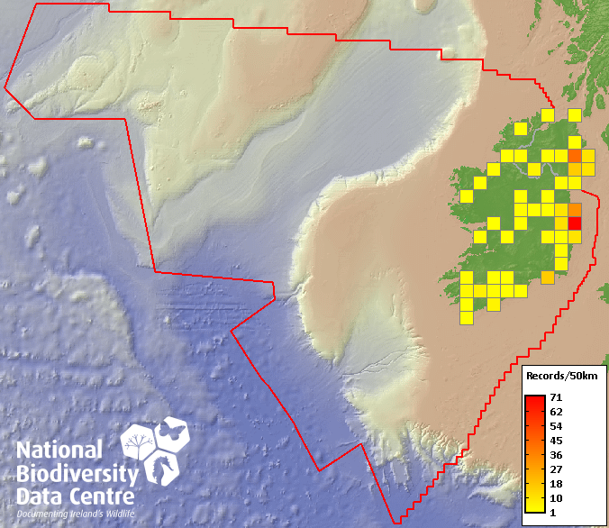 Distribution of the number of records recorded within each 10km grid square (ITM).Marine Map - 50km