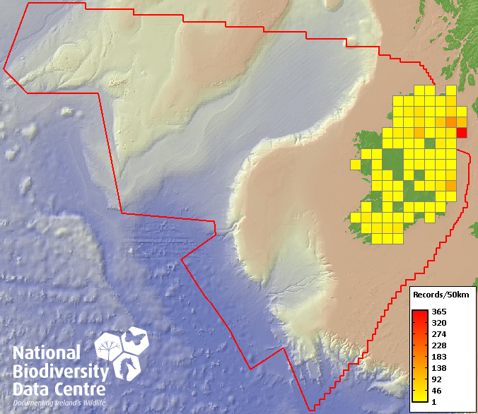 Distribution of the number of records recorded within each 10km grid square (ITM).Marine Map - 50km
