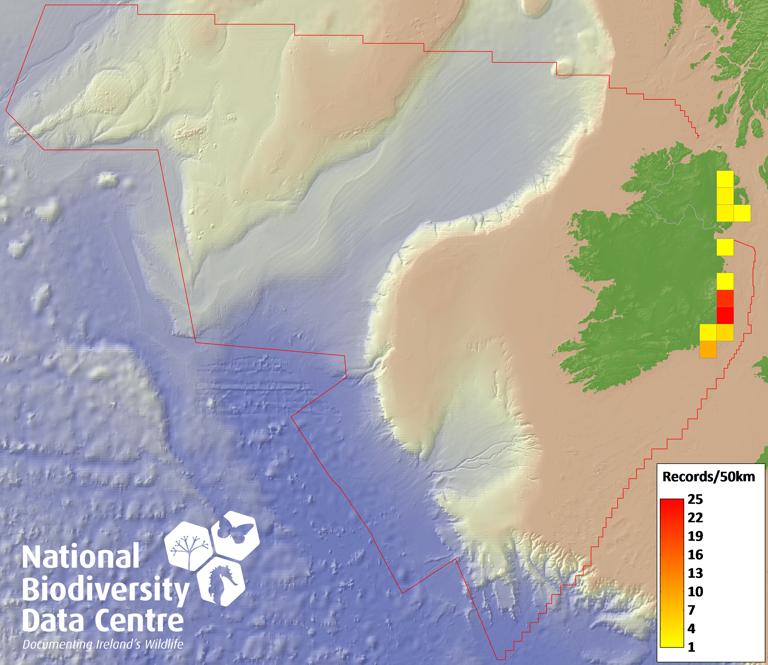 Distribution of the number of records recorded within each 10km grid square (ITM).Marine Map - 50km
