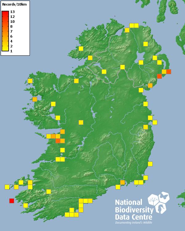 Distribution of the number of records recorded within each 10km grid square (ITM).Marine Map - 50km