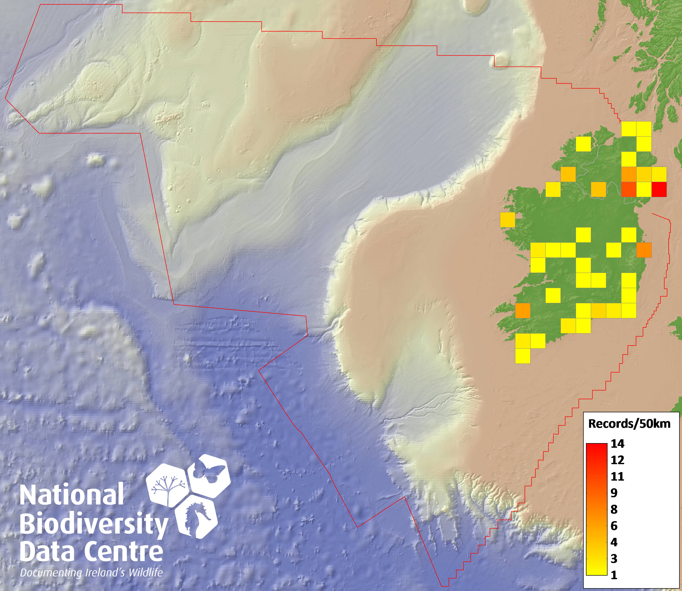 Distribution of the number of records recorded within each 10km grid square (ITM).Marine Map - 50km