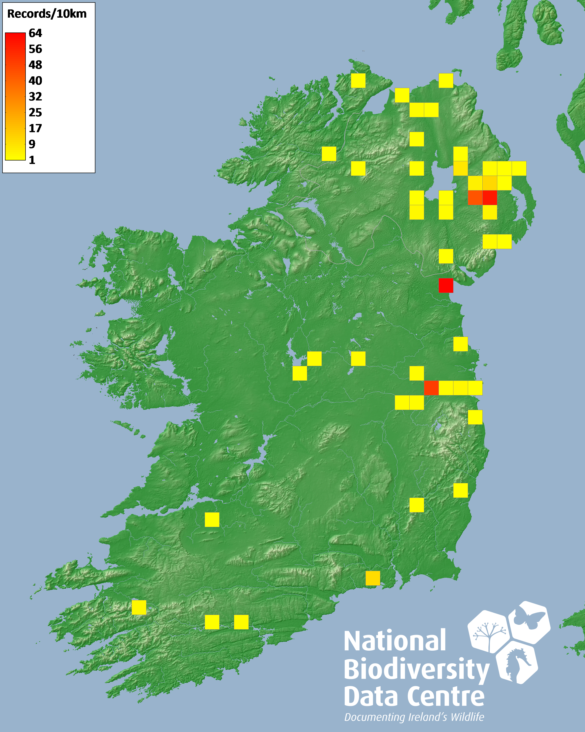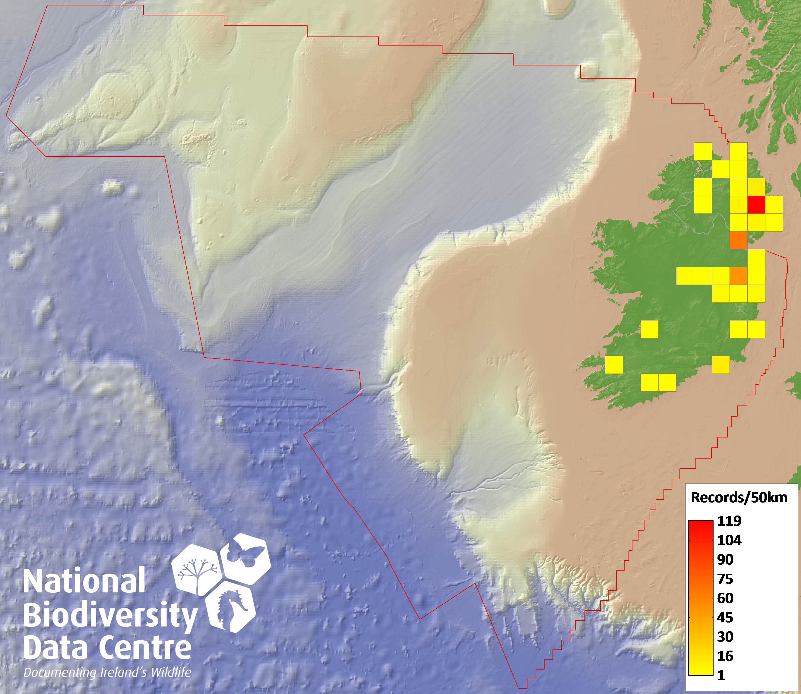 Distribution of the number of records recorded within each 10km grid square (ITM).Marine Map - 50km