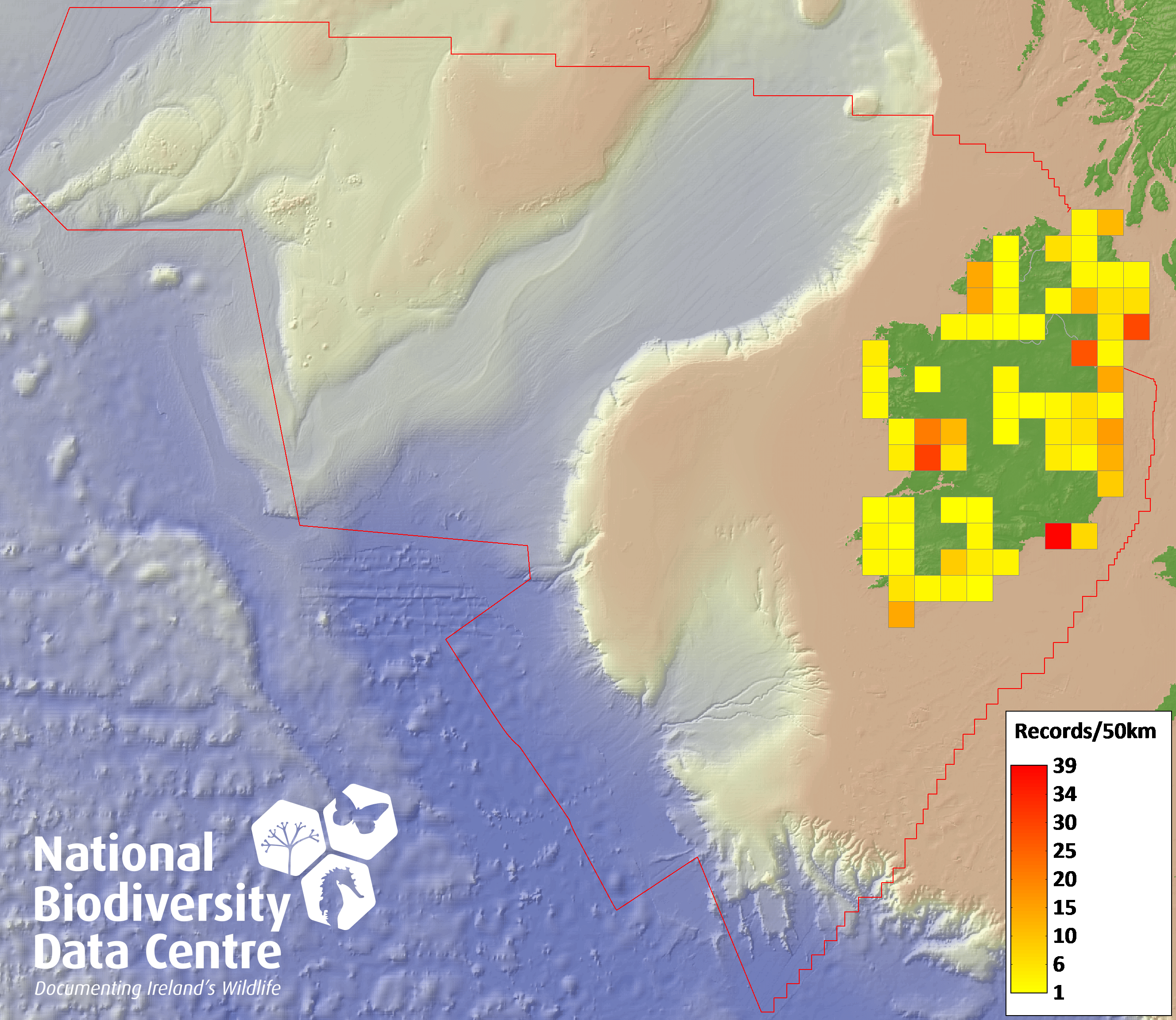 Distribution of the number of records recorded within each 10km grid square (ITM).Marine Map - 50km