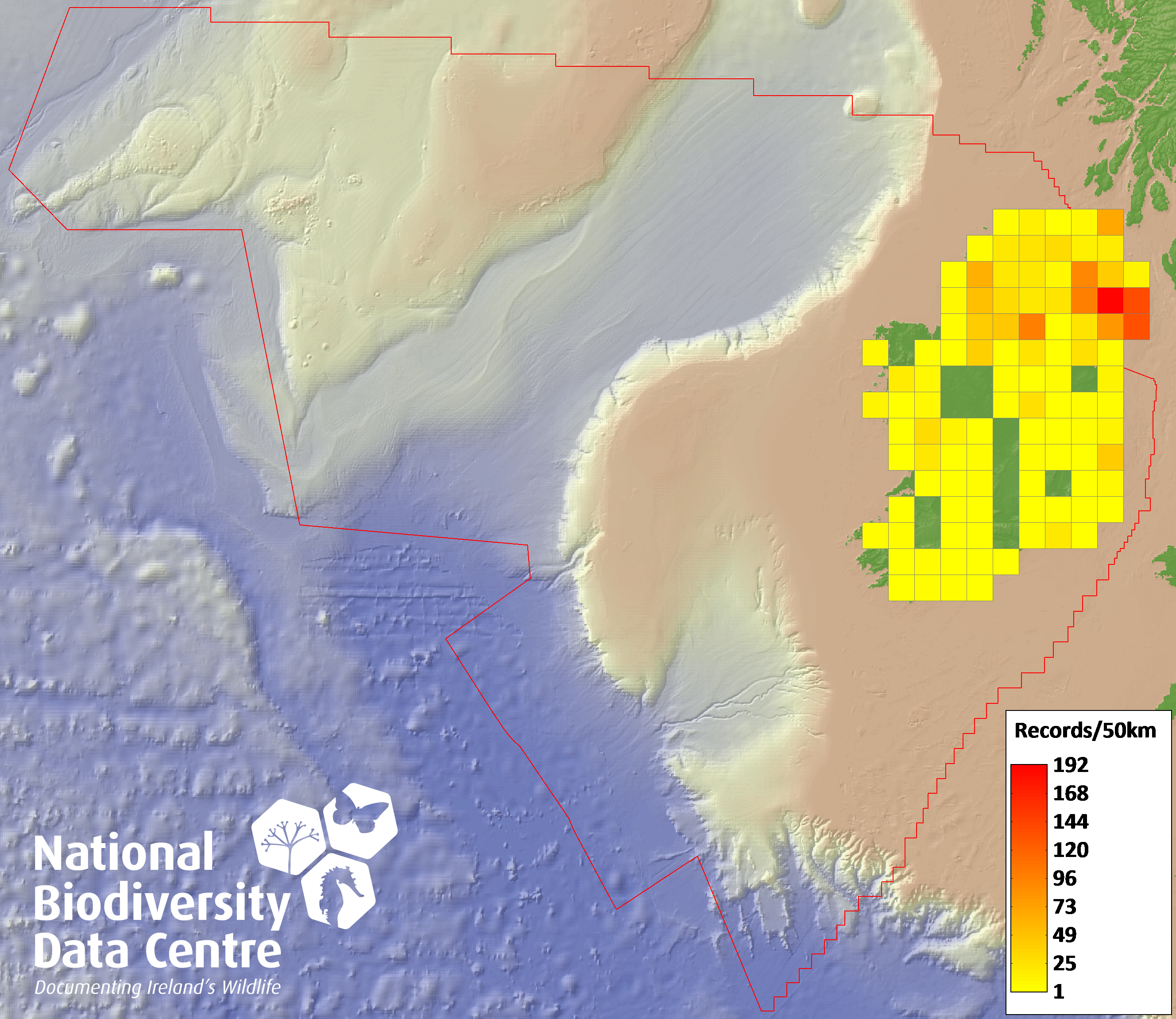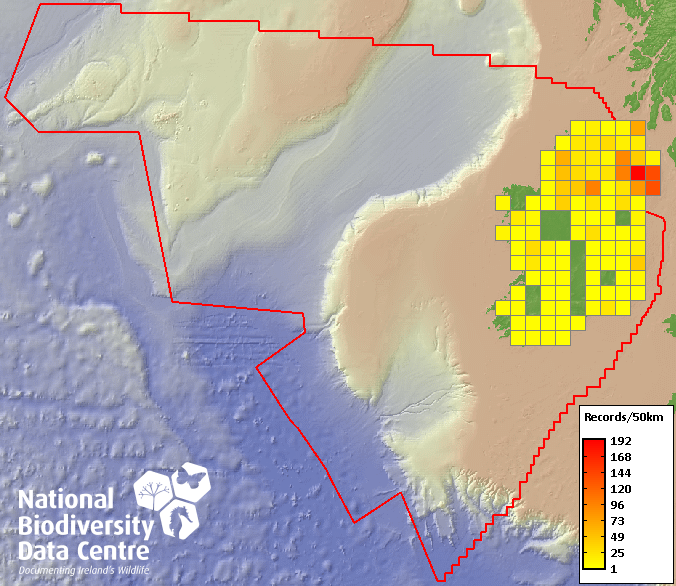 Distribution of the number of records recorded within each 10km grid square (ITM).Marine Map - 50km