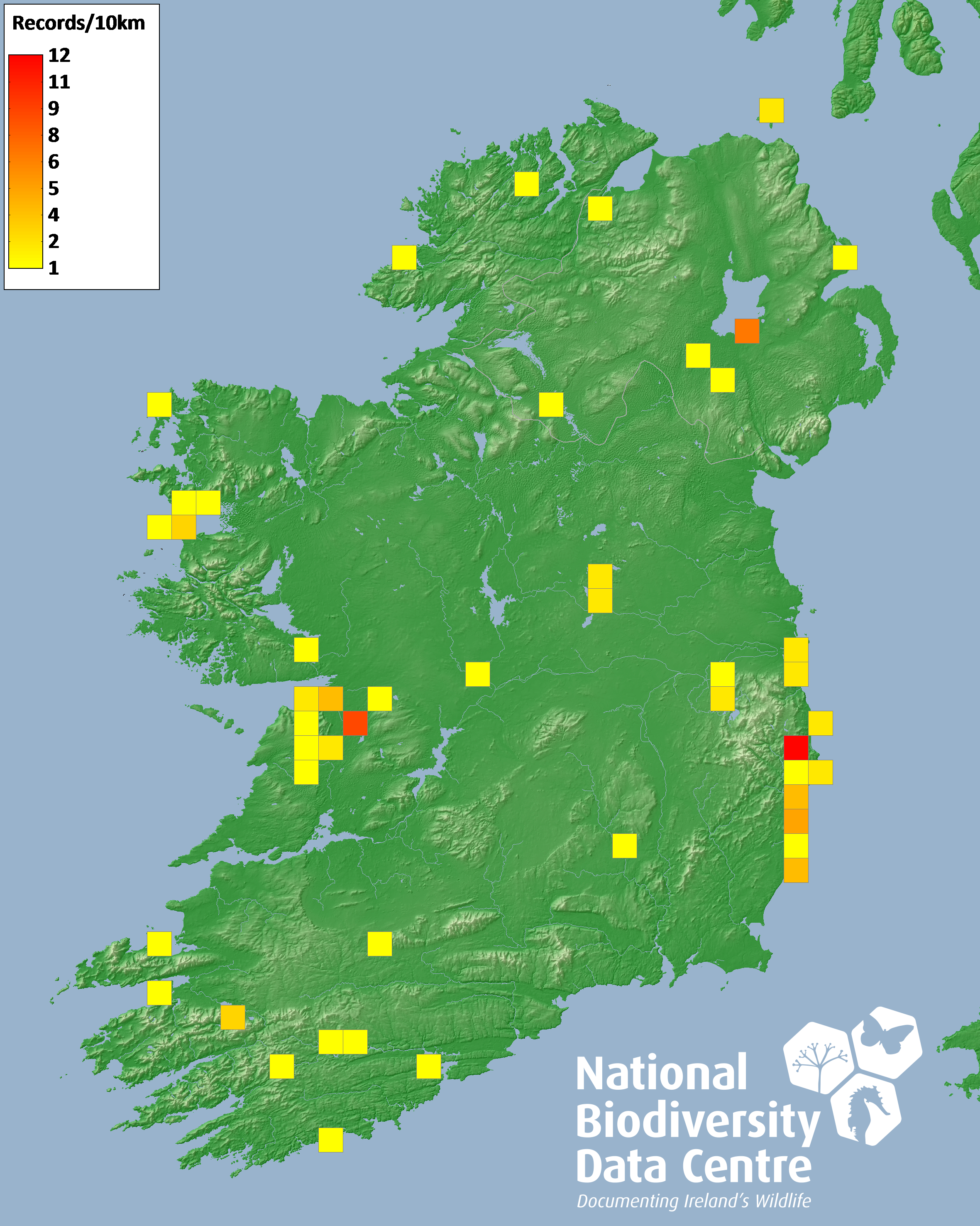 Distribution of the number of records recorded within each 10km grid square (ITM).Marine Map - 50km