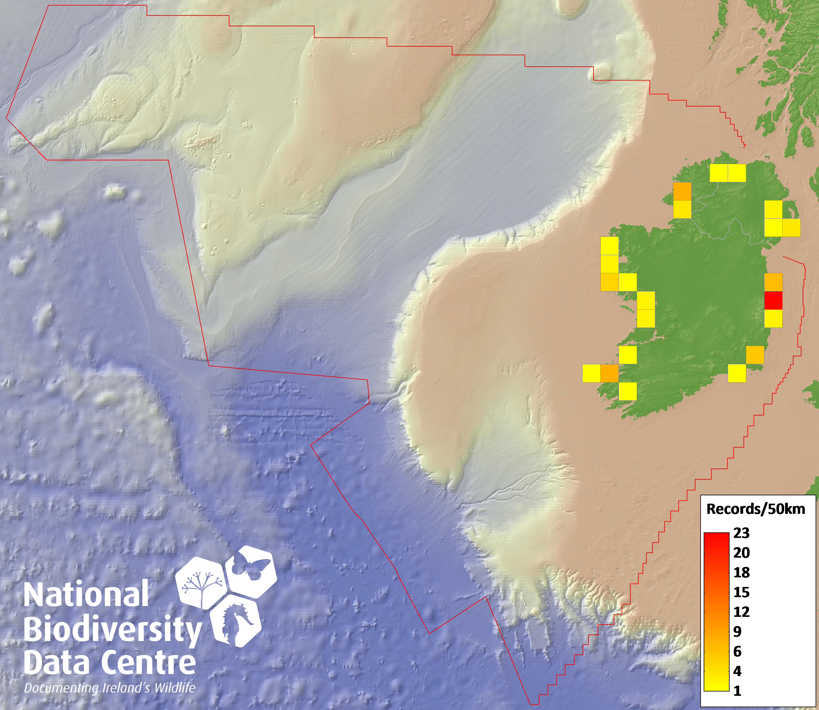 Distribution of the number of records recorded within each 10km grid square (ITM).Marine Map - 50km
