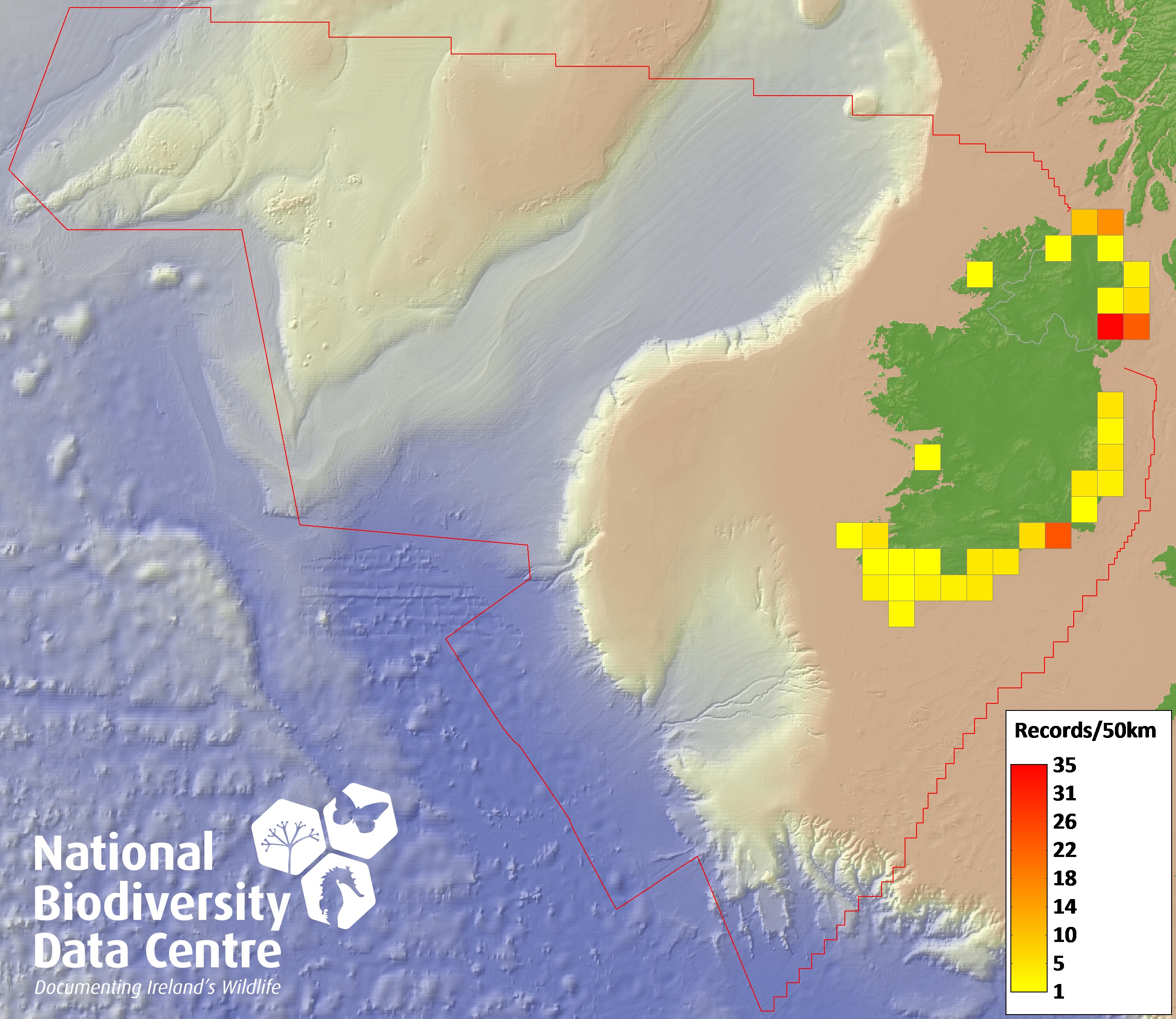 Distribution of the number of records recorded within each 10km grid square (ITM).Marine Map - 50km