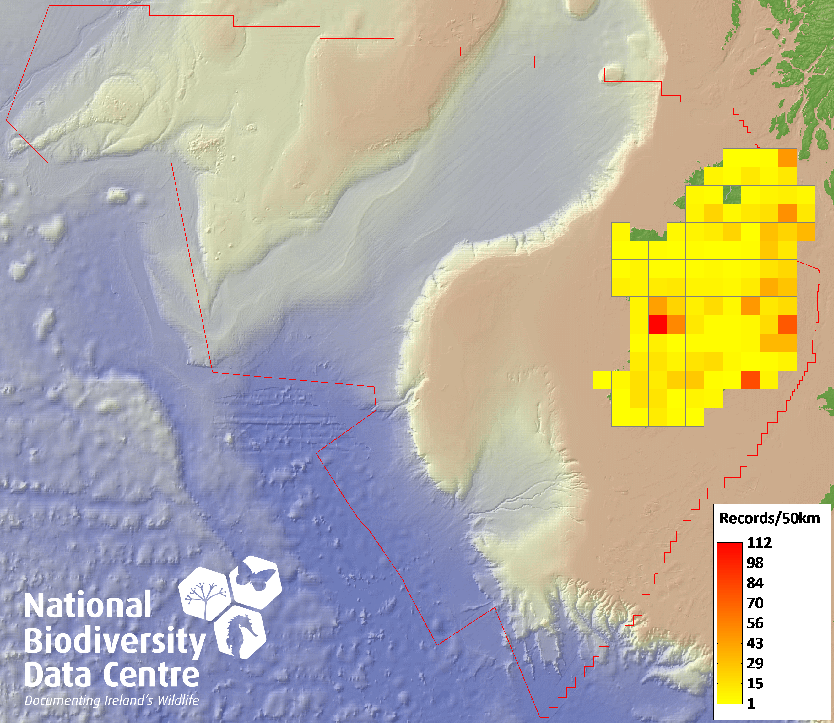 Distribution of the number of records recorded within each 10km grid square (ITM).Marine Map - 50km