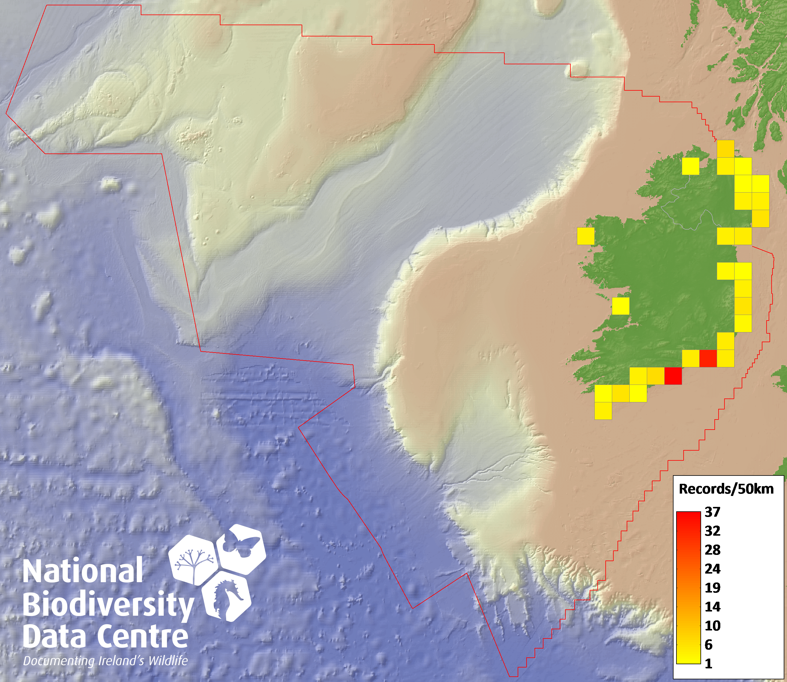 Distribution of the number of records recorded within each 10km grid square (ITM).Marine Map - 50km