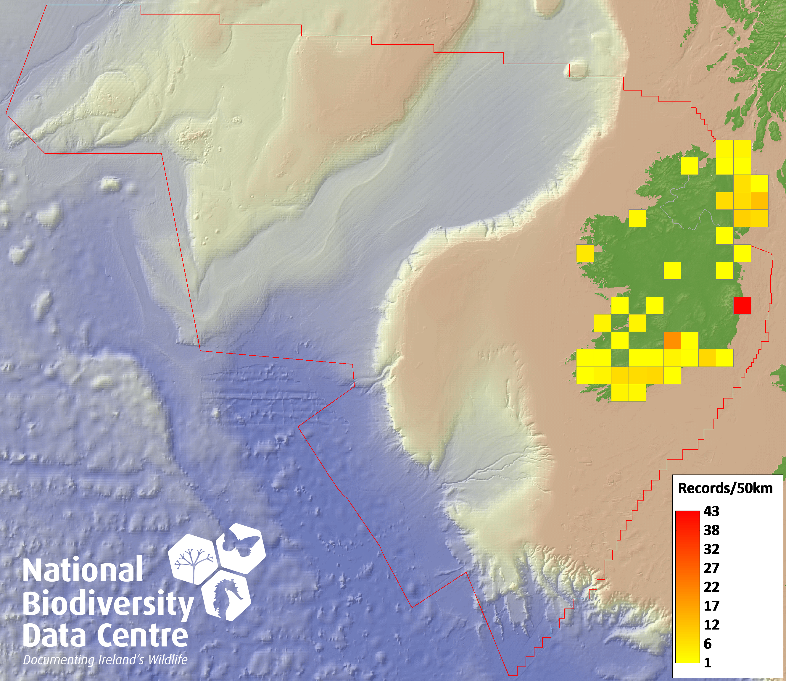 Distribution of the number of records recorded within each 10km grid square (ITM).Marine Map - 50km