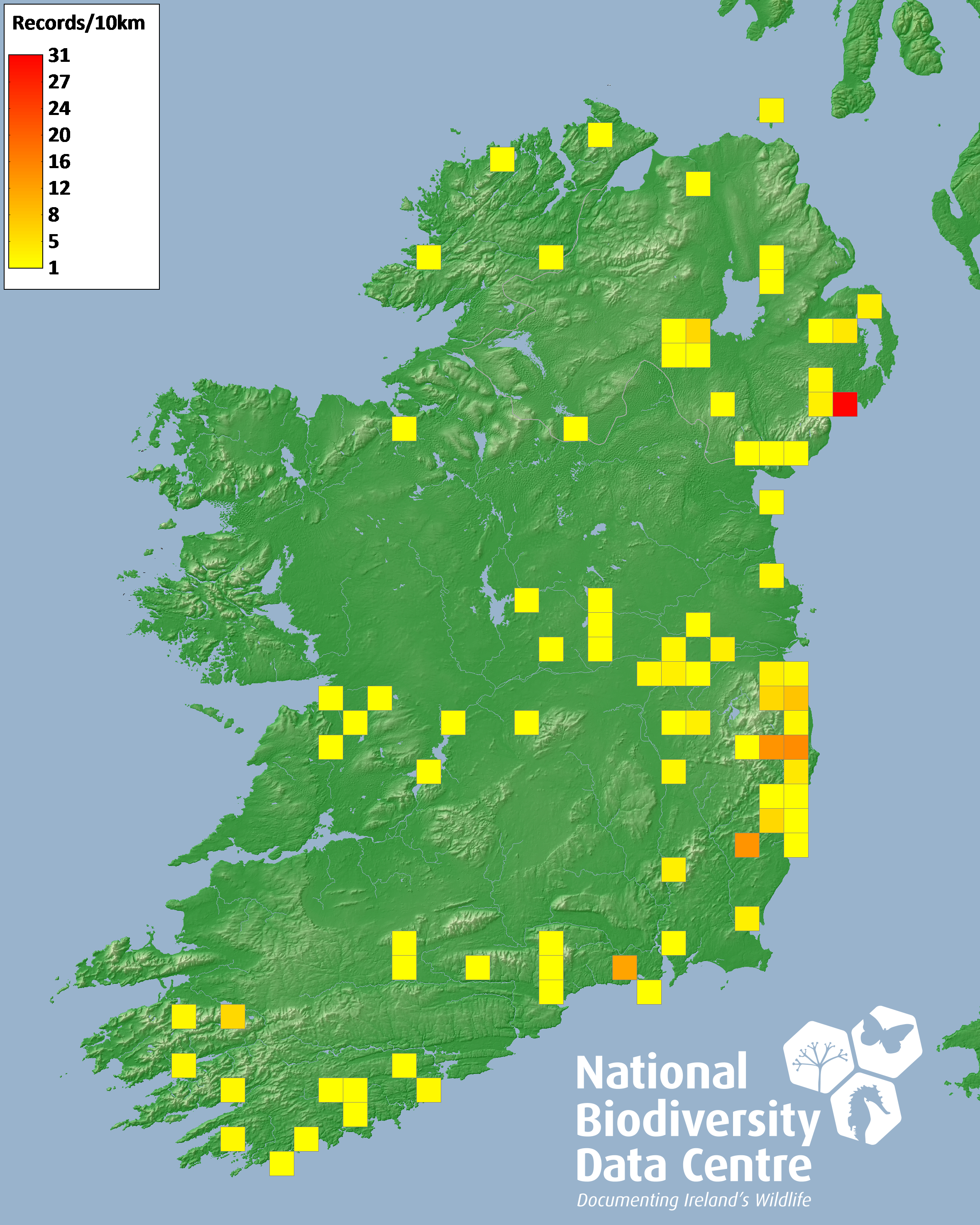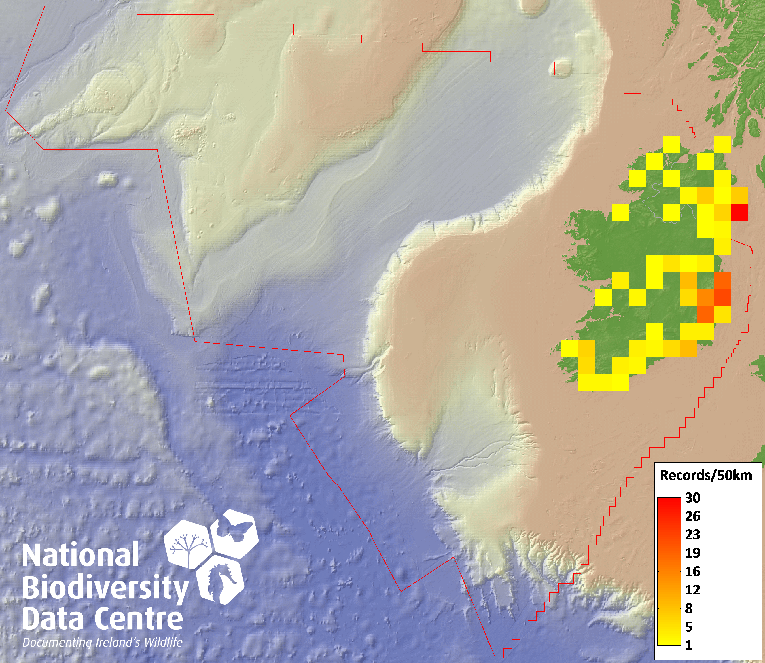 Distribution of the number of records recorded within each 10km grid square (ITM).Marine Map - 50km