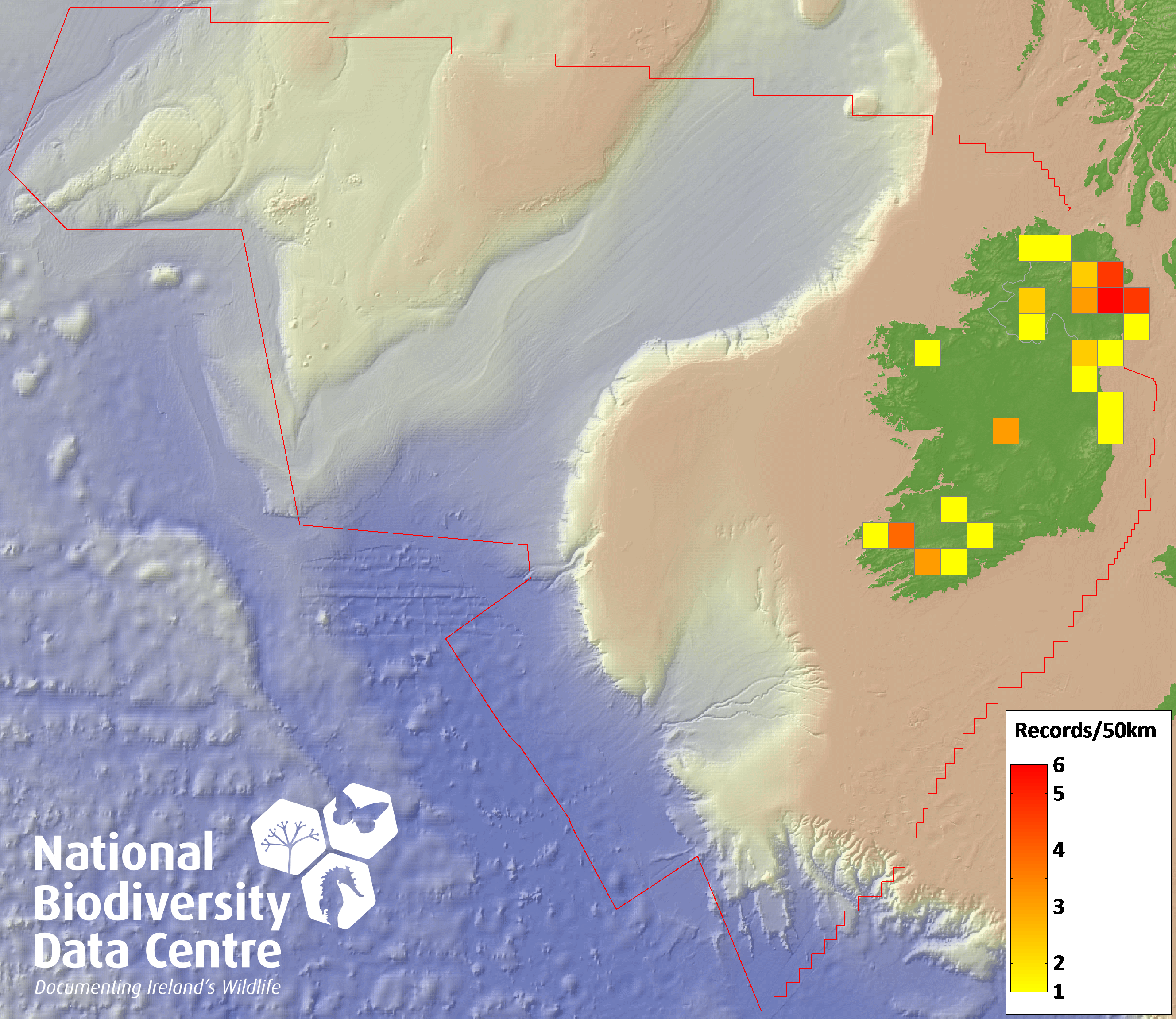Distribution of the number of records recorded within each 10km grid square (ITM).Marine Map - 50km
