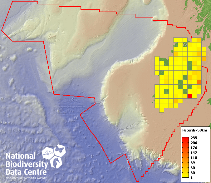 Distribution of the number of records recorded within each 10km grid square (ITM).Marine Map - 50km