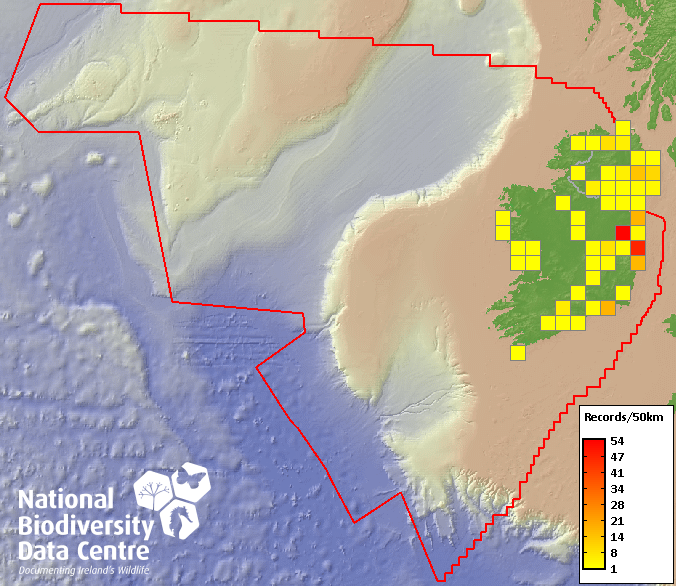 Distribution of the number of records recorded within each 10km grid square (ITM).Marine Map - 50km