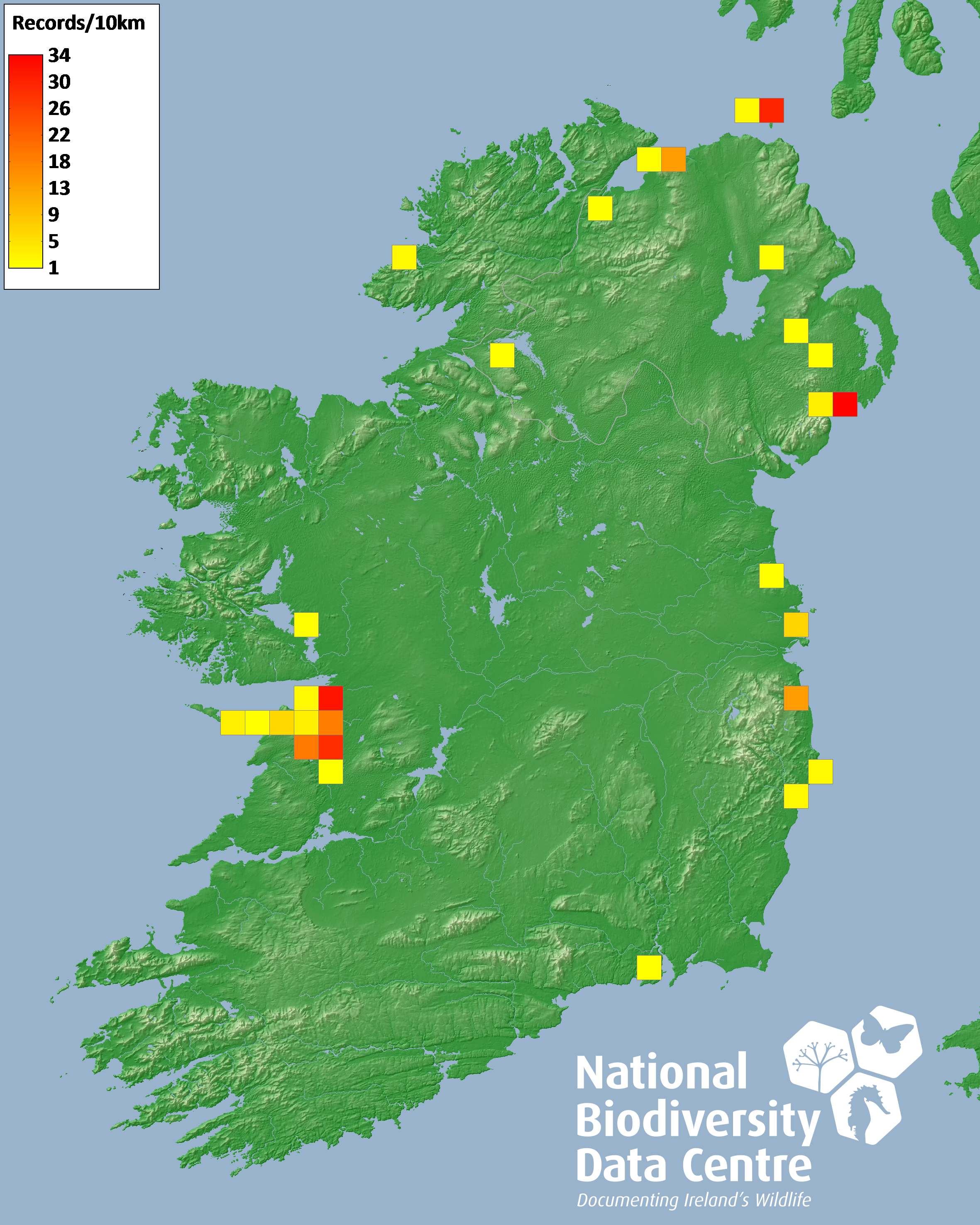 Distribution of the number of records recorded within each 10km grid square (ITM).Marine Map - 50km