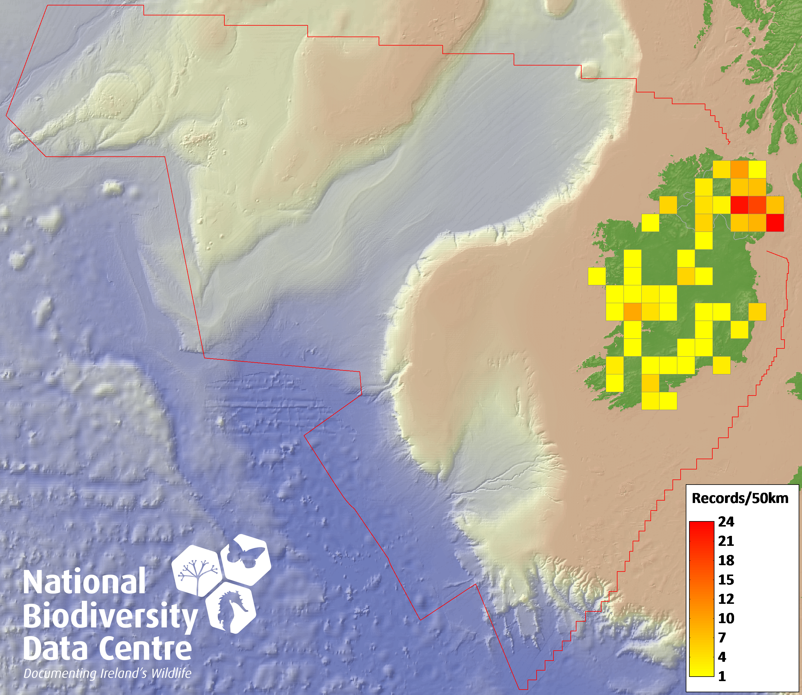 Distribution of the number of records recorded within each 10km grid square (ITM).Marine Map - 50km
