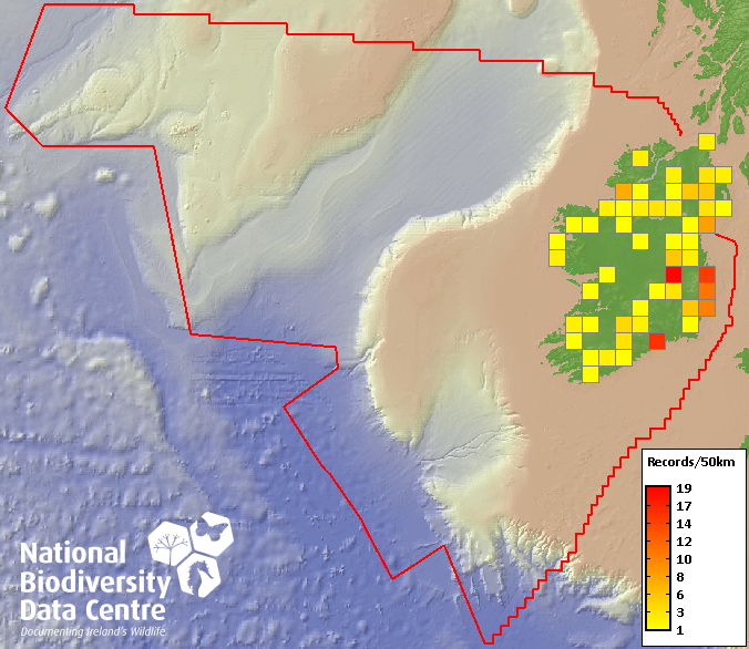 Distribution of the number of records recorded within each 10km grid square (ITM).Marine Map - 50km