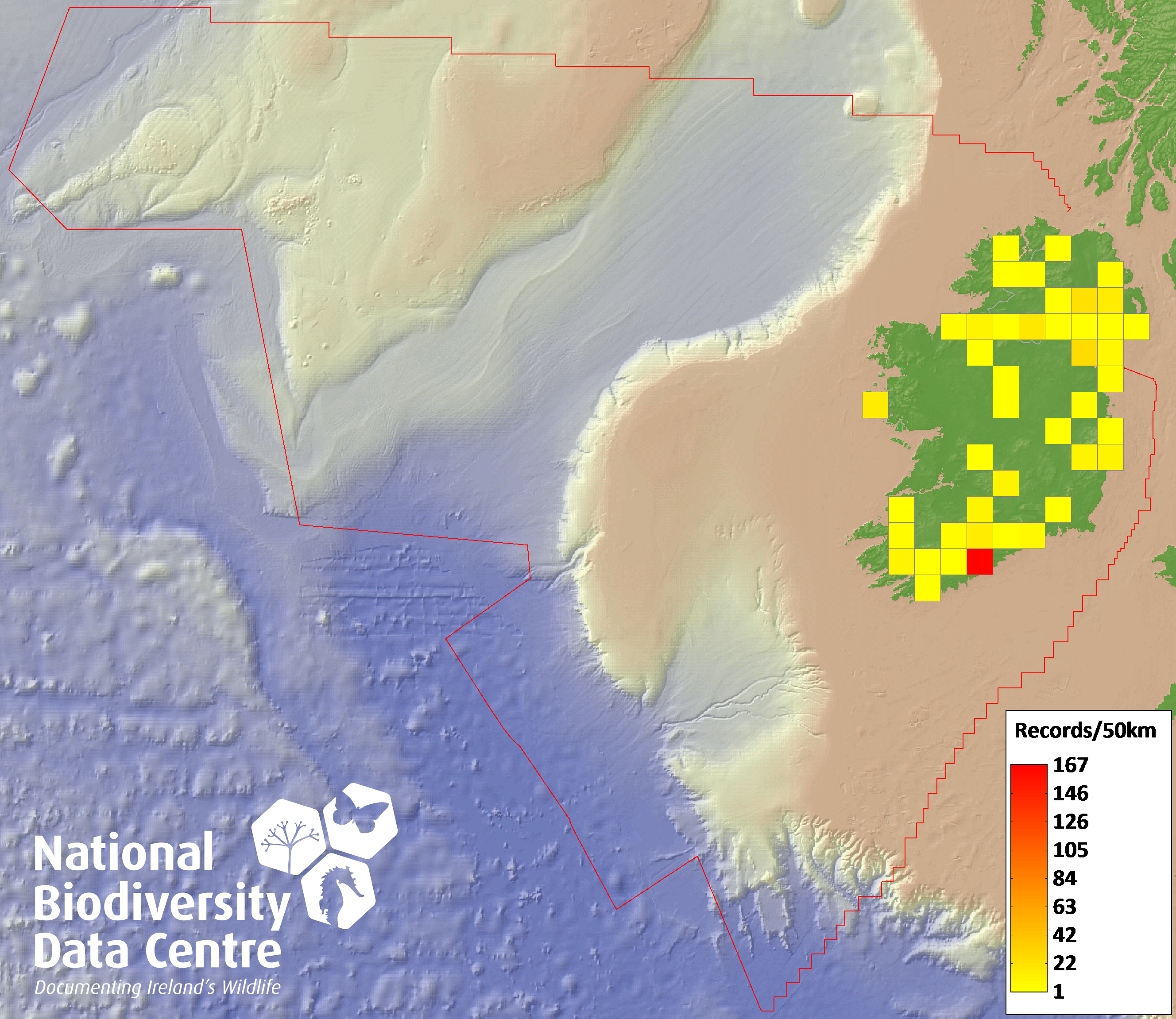 Distribution of the number of records recorded within each 10km grid square (ITM).Marine Map - 50km