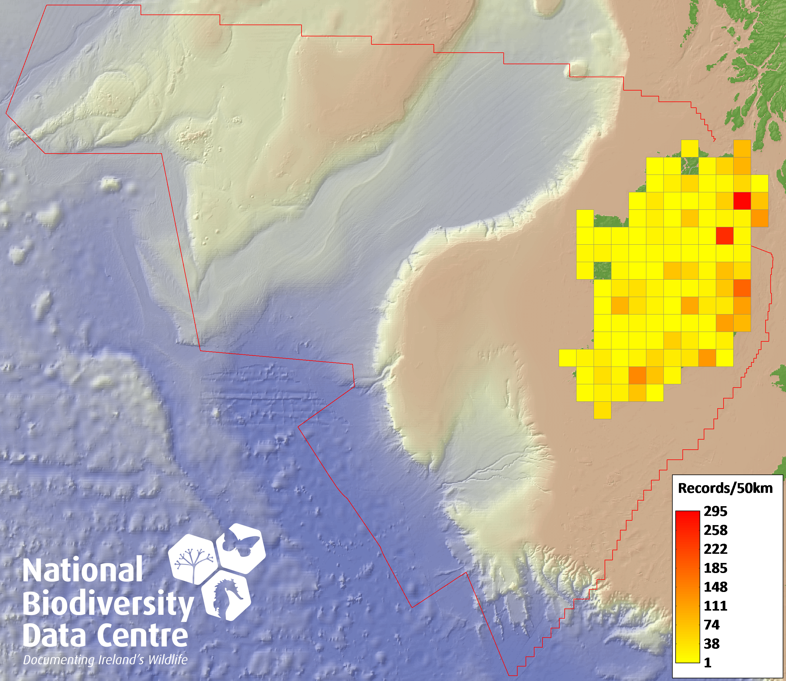 Distribution of the number of records recorded within each 10km grid square (ITM).Marine Map - 50km