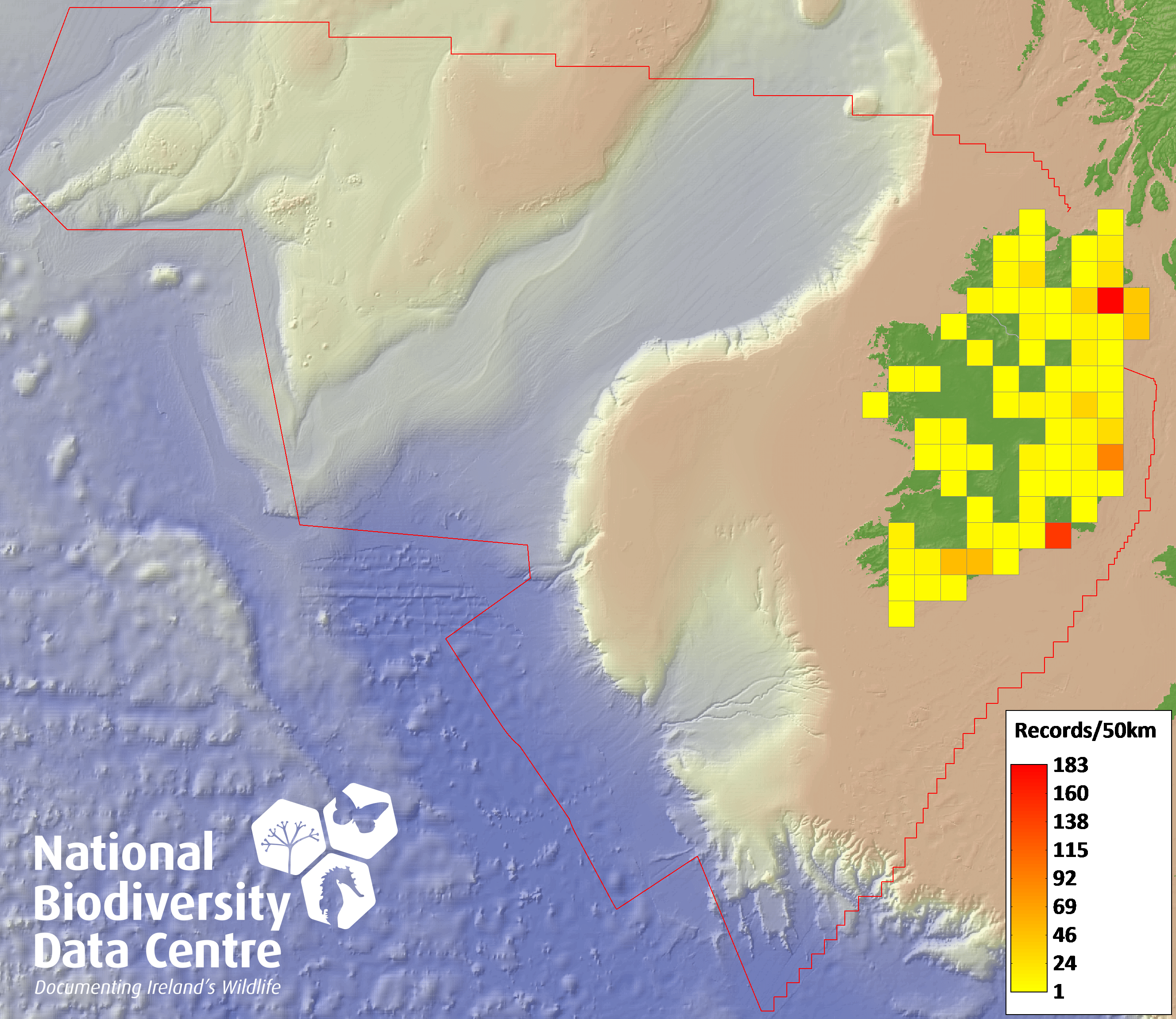 Distribution of the number of records recorded within each 10km grid square (ITM).Marine Map - 50km