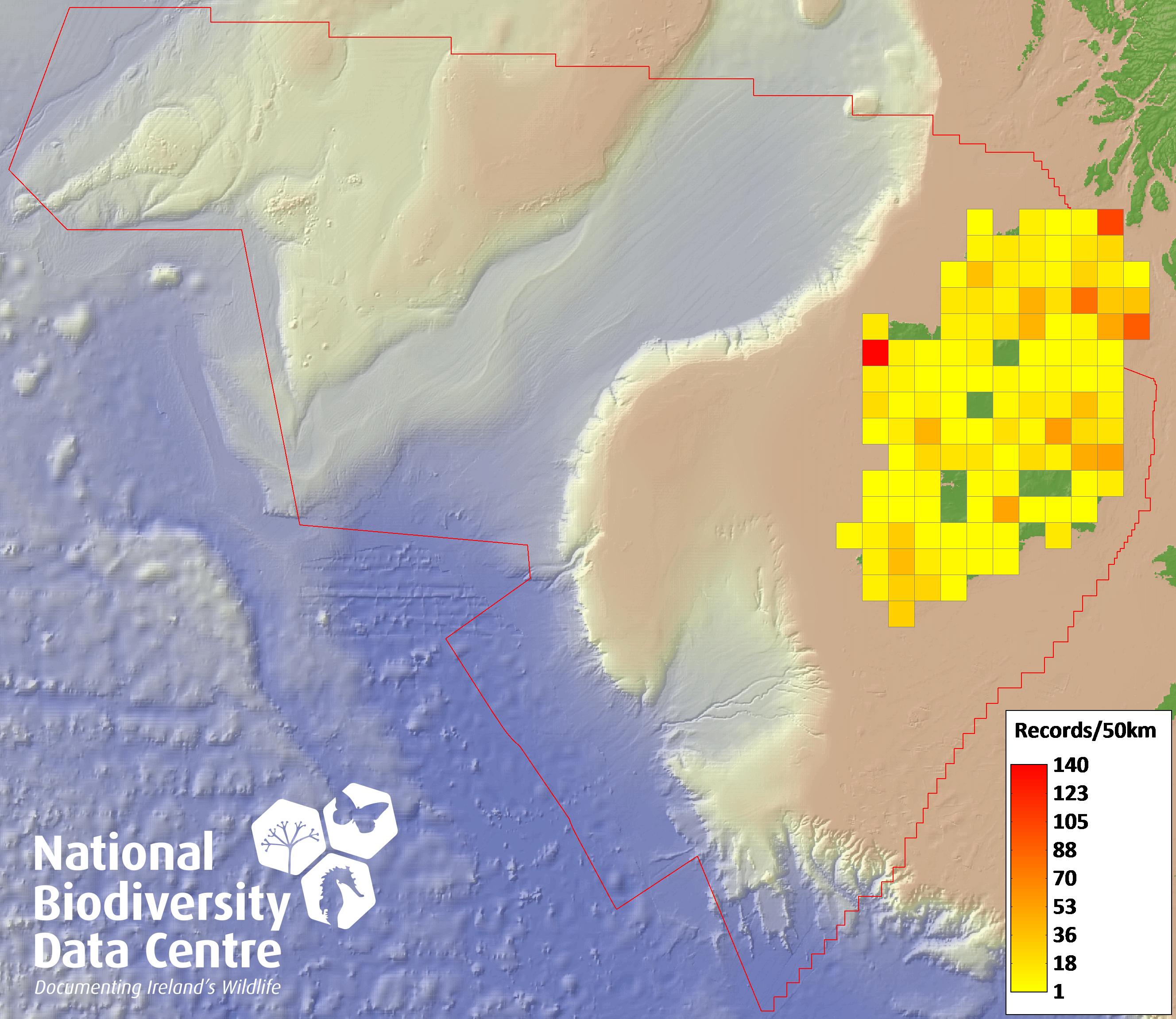 Distribution of the number of records recorded within each 10km grid square (ITM).Marine Map - 50km