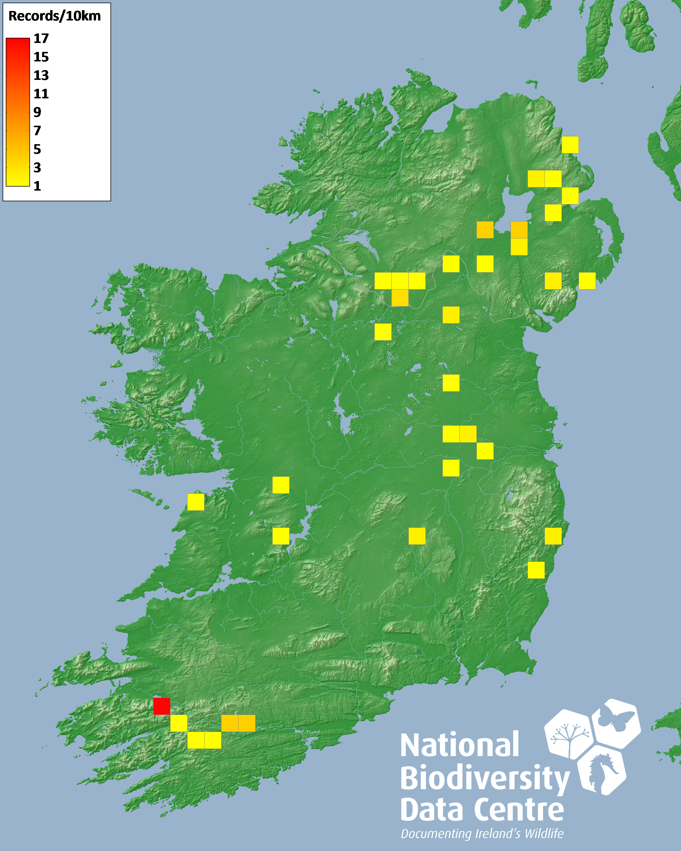 Distribution of the number of records recorded within each 10km grid square (ITM).Marine Map - 50km