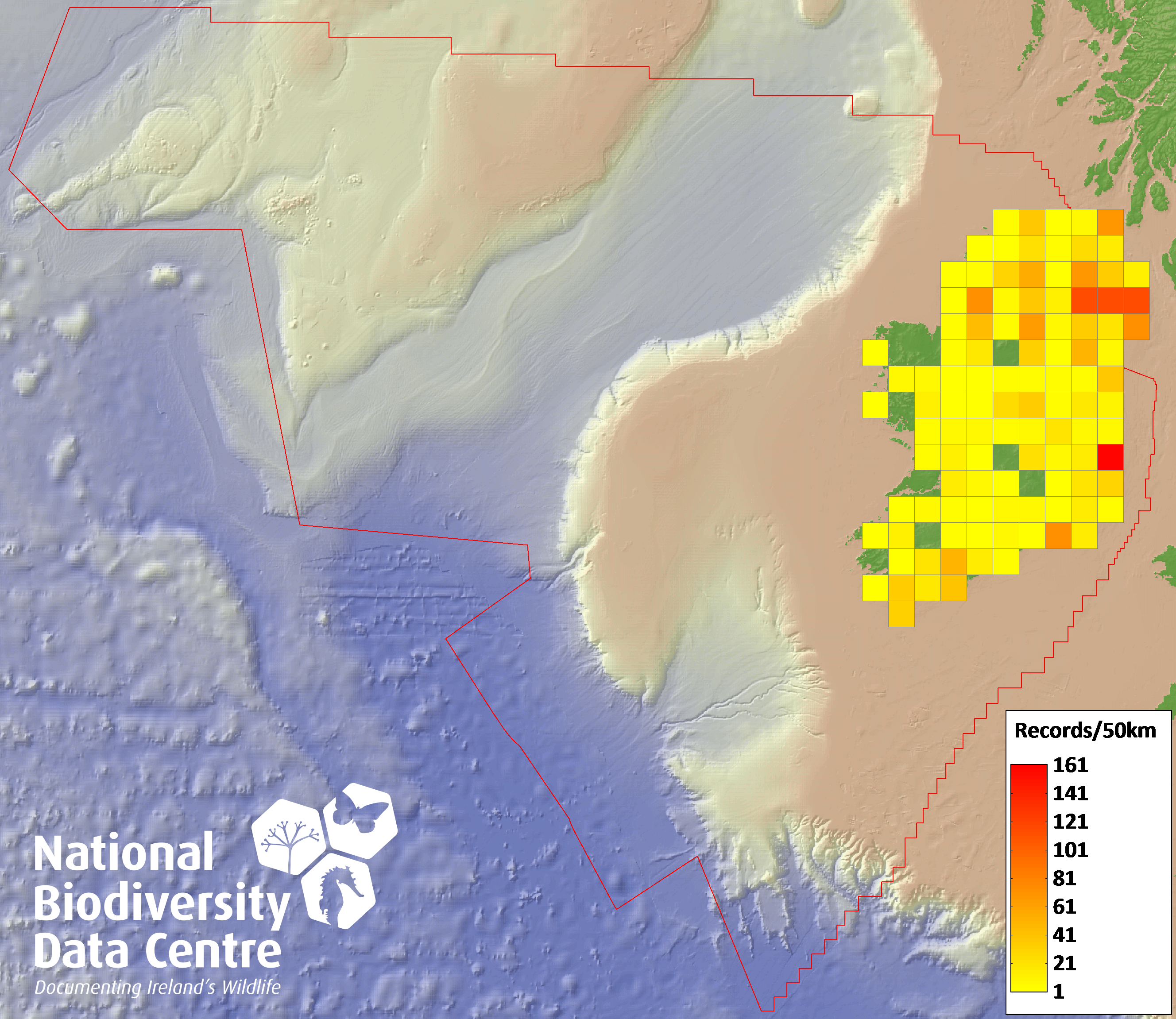 Distribution of the number of records recorded within each 10km grid square (ITM).Marine Map - 50km