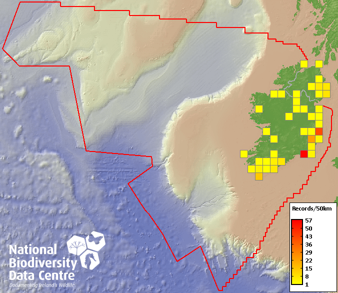 Distribution of the number of records recorded within each 10km grid square (ITM).Marine Map - 50km