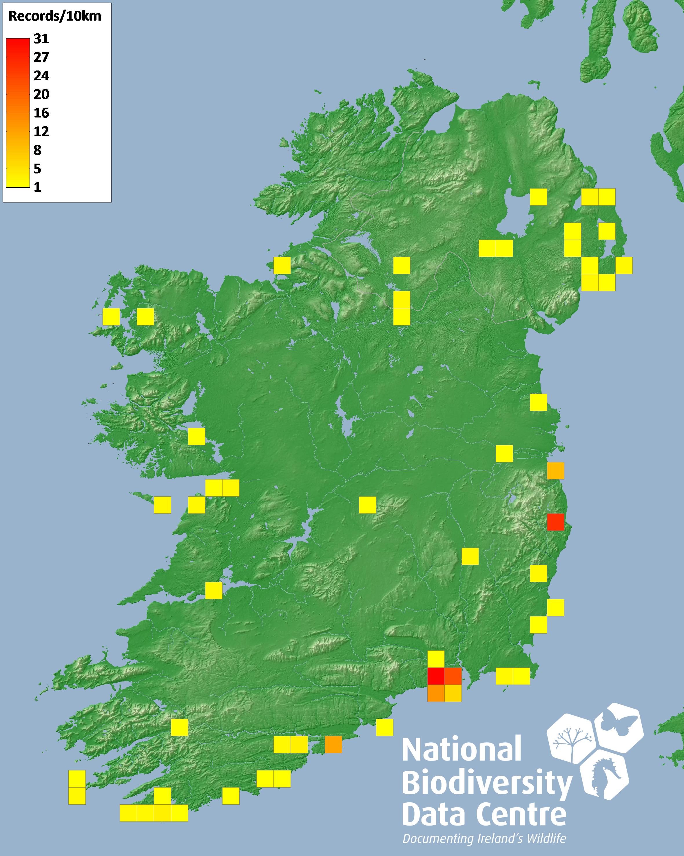 Distribution of the number of records recorded within each 10km grid square (ITM).Marine Map - 50km