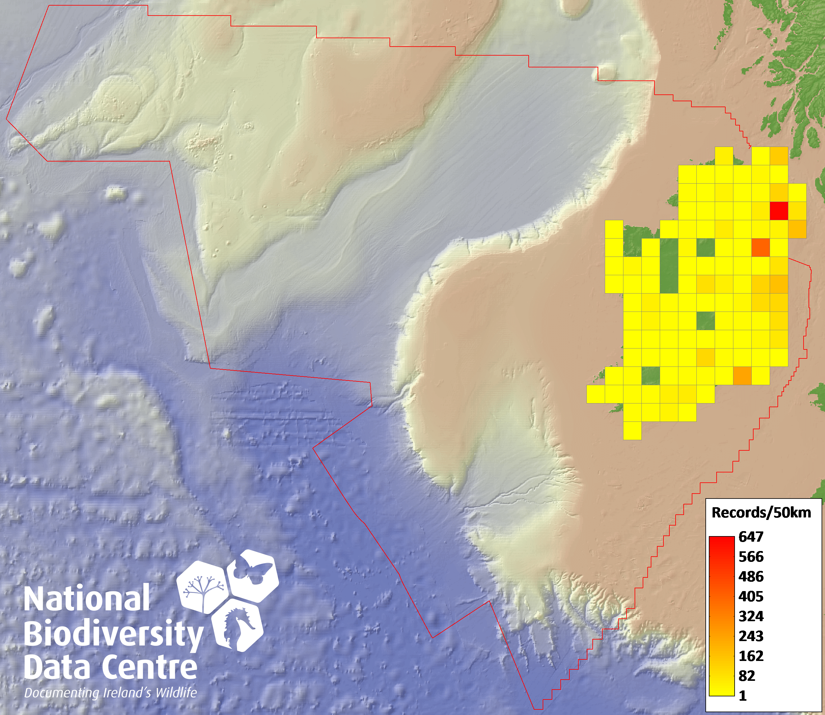 Distribution of the number of records recorded within each 10km grid square (ITM).Marine Map - 50km