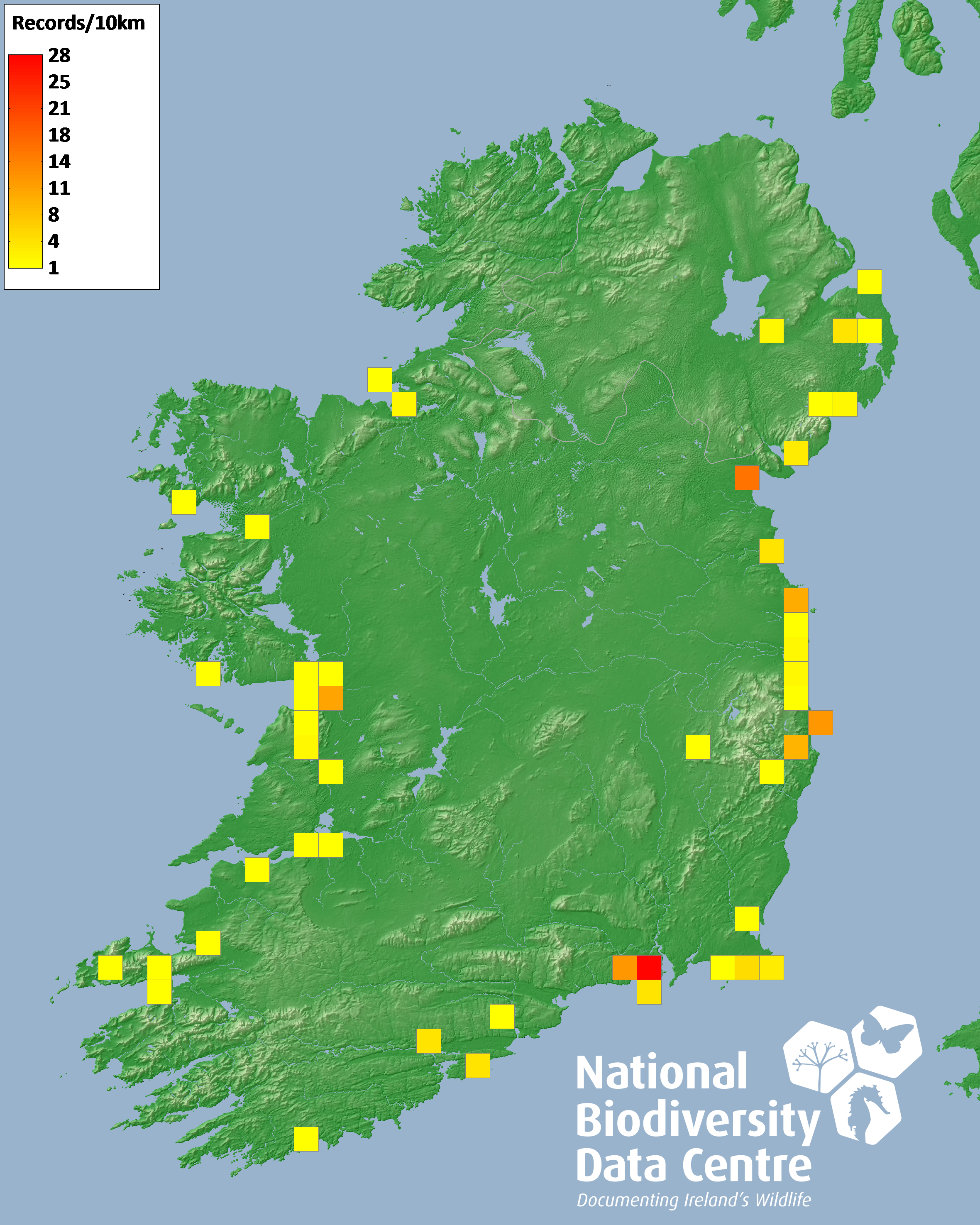 Distribution of the number of records recorded within each 10km grid square (ITM).Marine Map - 50km