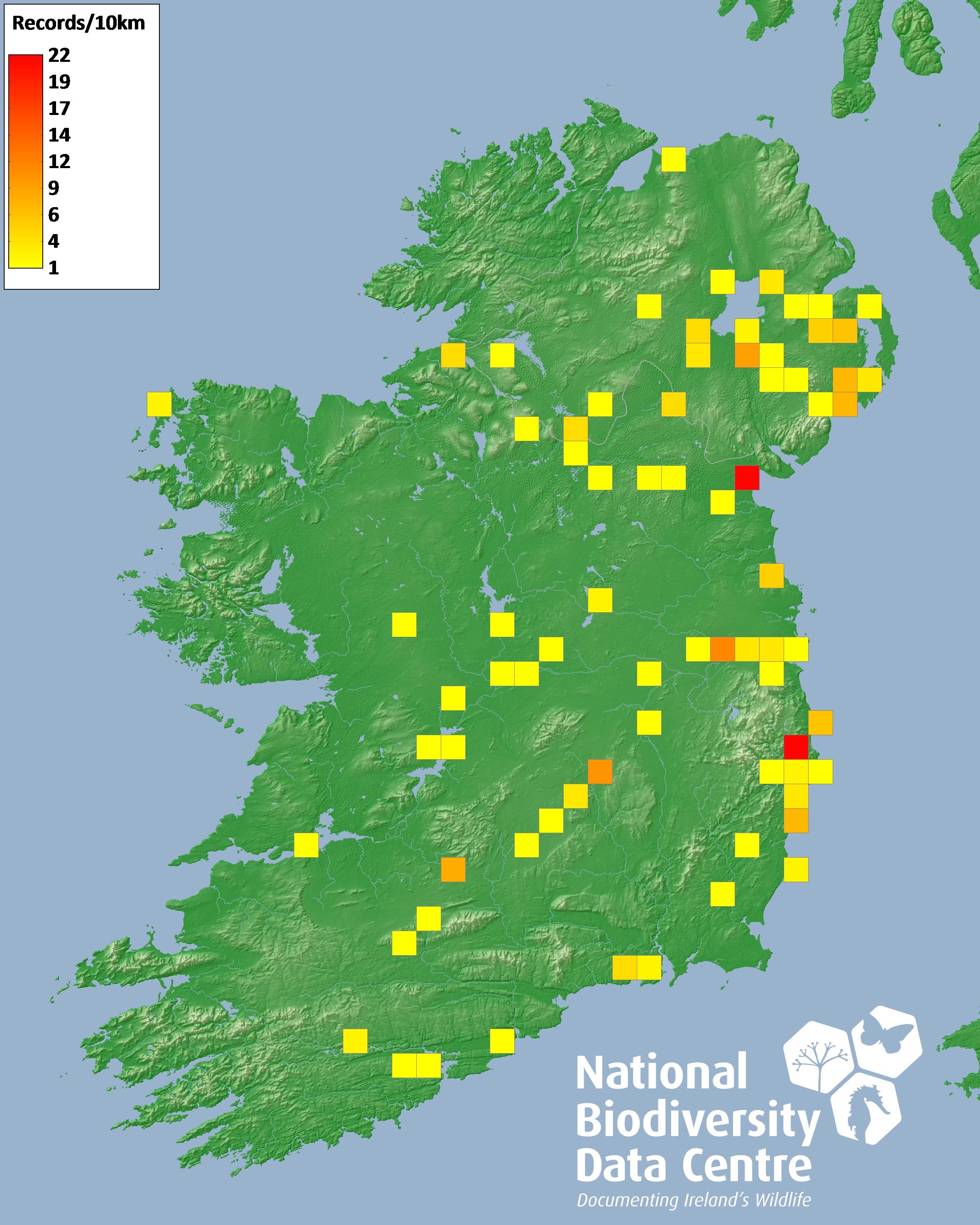 Distribution of the number of records recorded within each 10km grid square (ITM).Marine Map - 50km