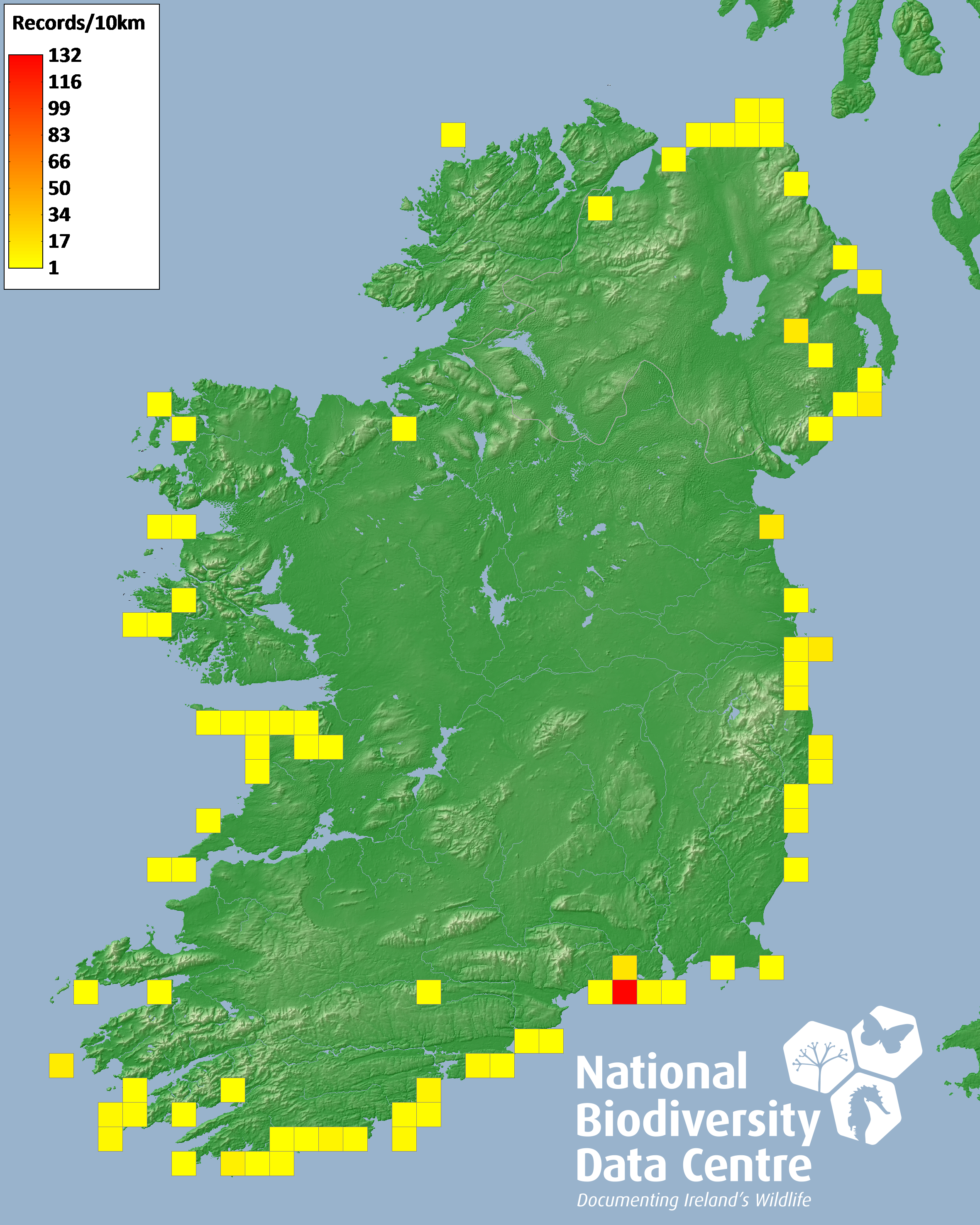Distribution of the number of records recorded within each 10km grid square (ITM).Marine Map - 50km