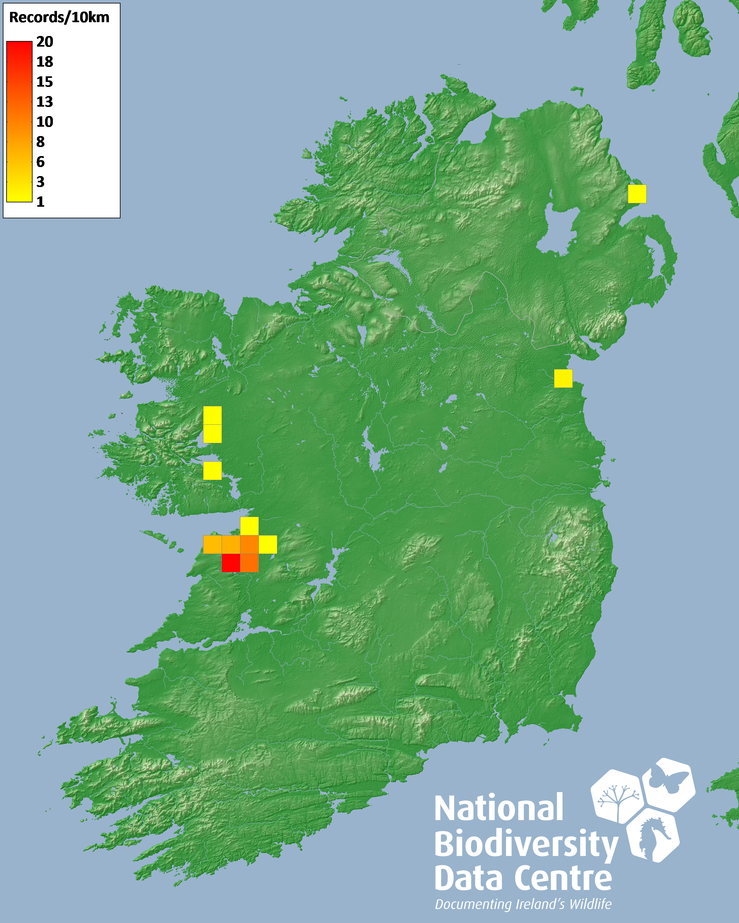 Distribution of the number of records recorded within each 10km grid square (ITM).Marine Map - 50km