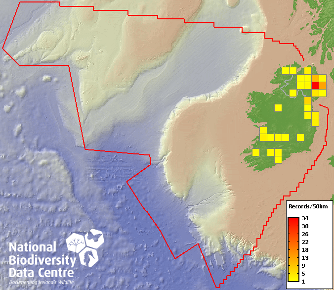 Distribution of the number of records recorded within each 10km grid square (ITM).Marine Map - 50km