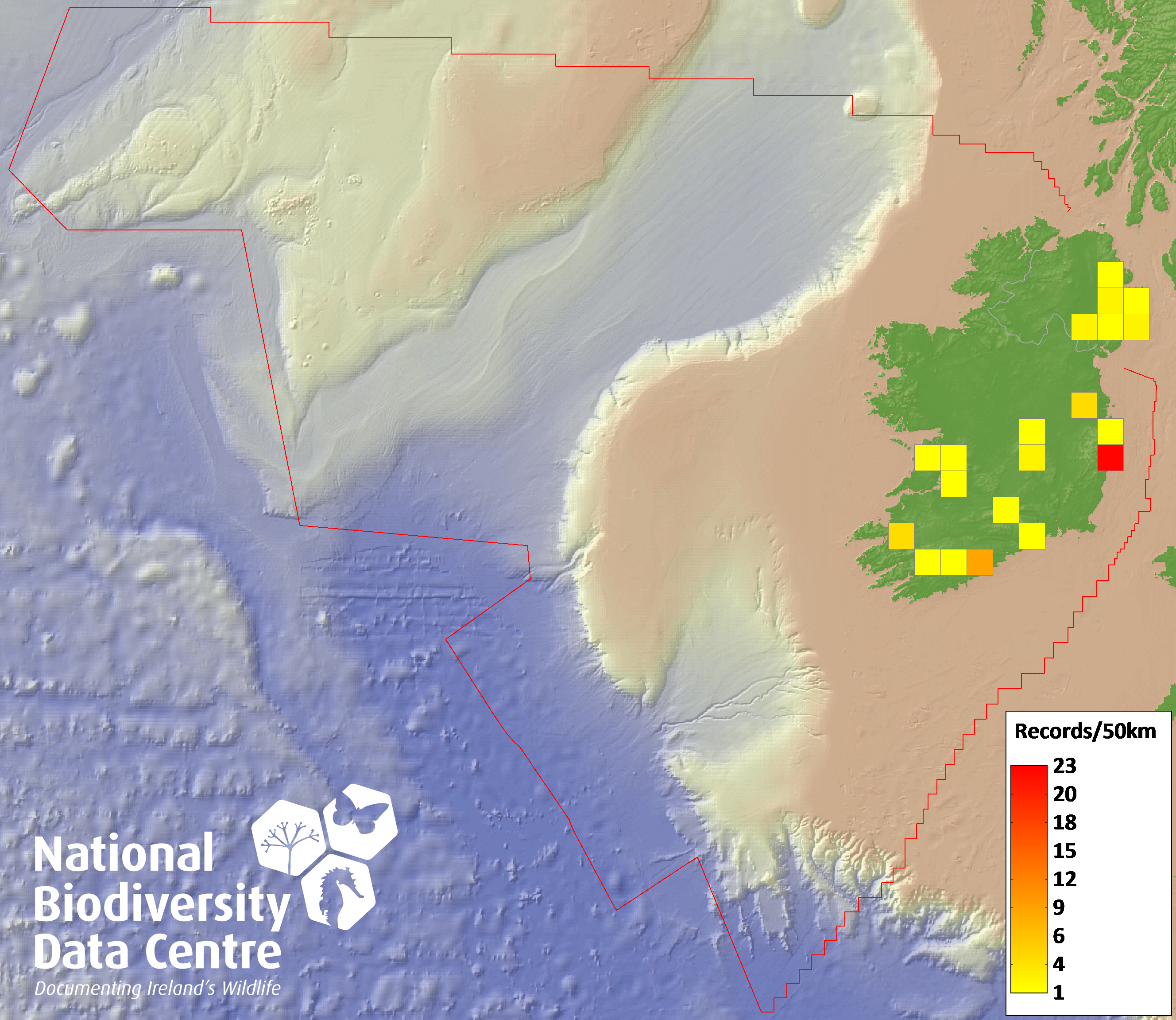 Distribution of the number of records recorded within each 10km grid square (ITM).Marine Map - 50km