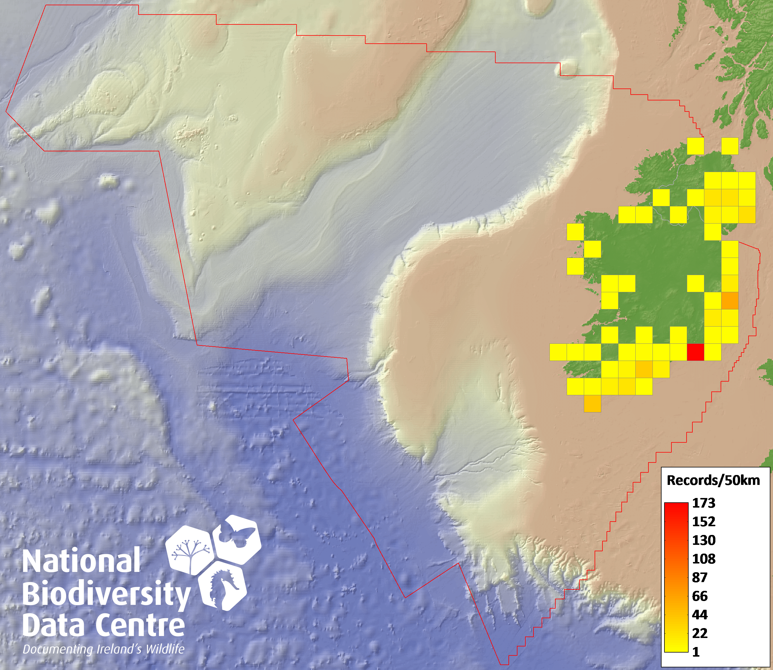 Distribution of the number of records recorded within each 10km grid square (ITM).Marine Map - 50km