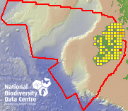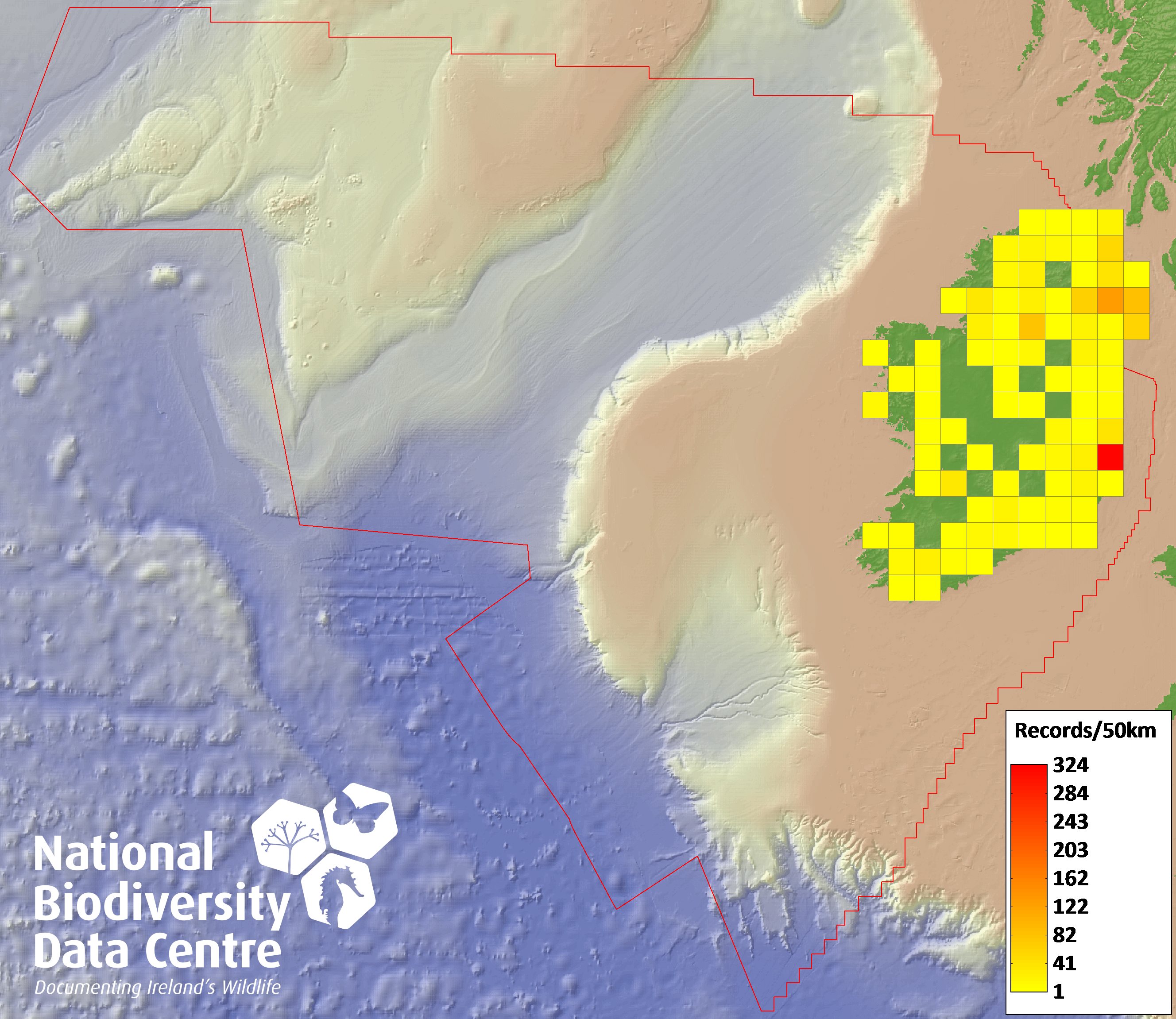 Distribution of the number of records recorded within each 10km grid square (ITM).Marine Map - 50km