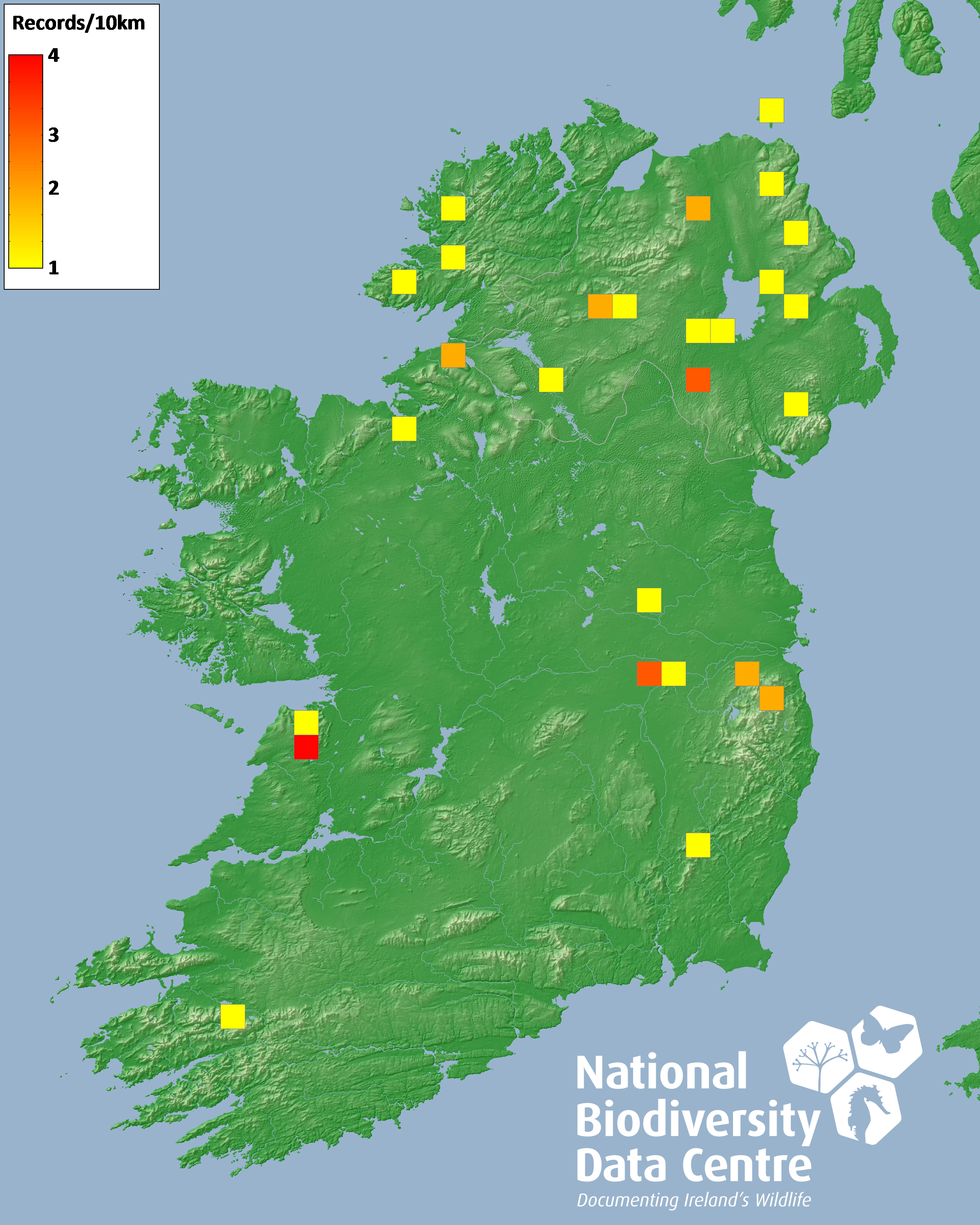 Distribution of the number of records recorded within each 10km grid square (ITM).Marine Map - 50km