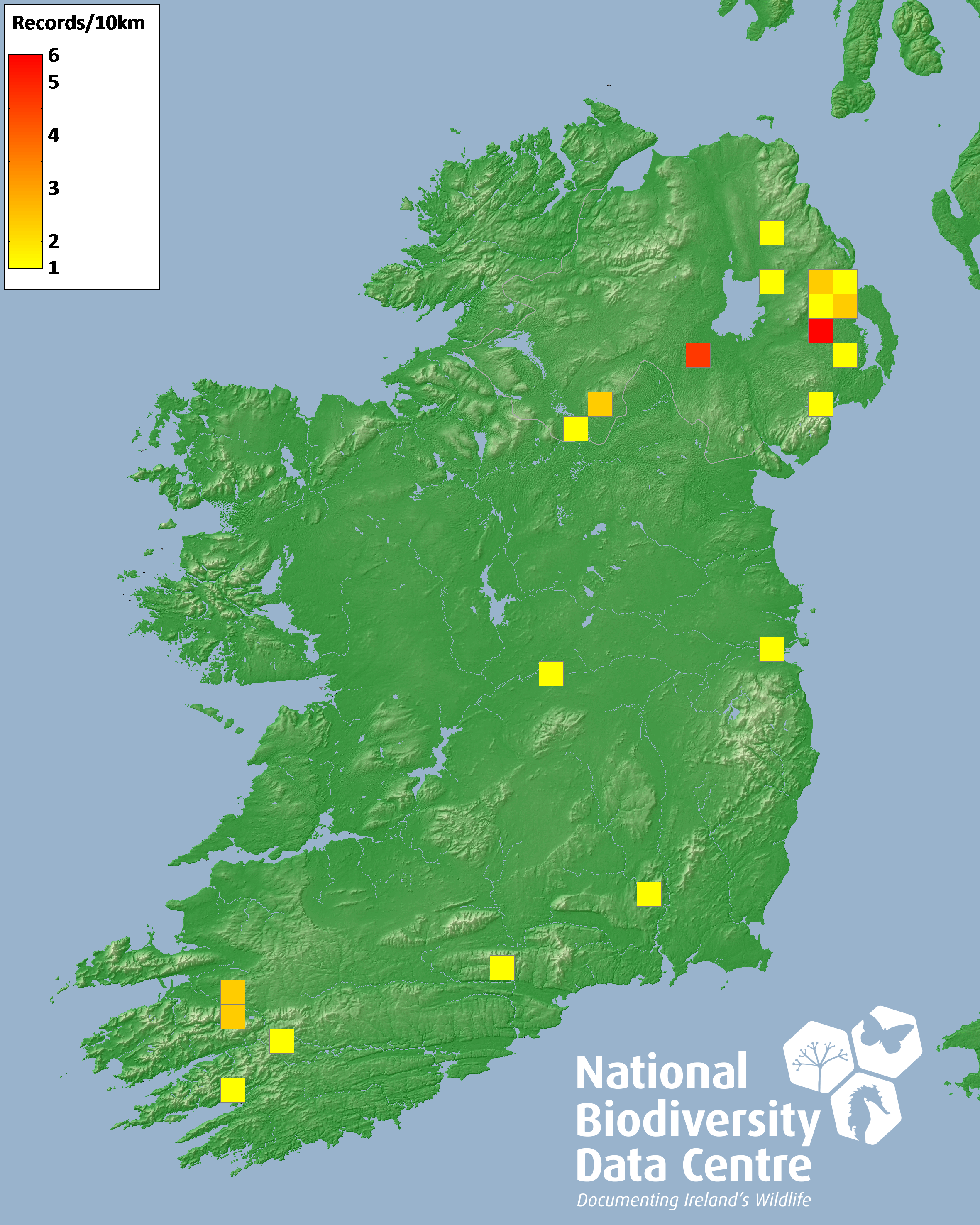 Distribution of the number of records recorded within each 10km grid square (ITM).Marine Map - 50km