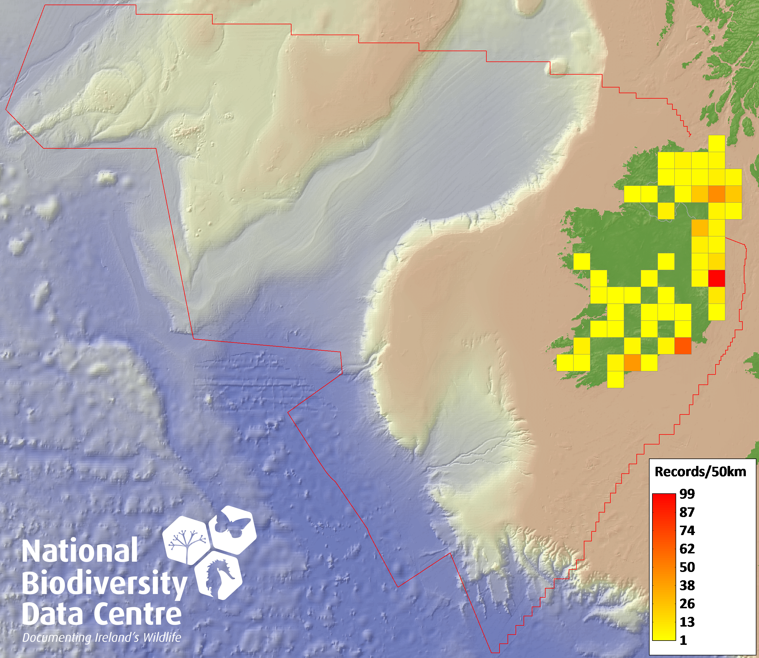 Distribution of the number of records recorded within each 10km grid square (ITM).Marine Map - 50km
