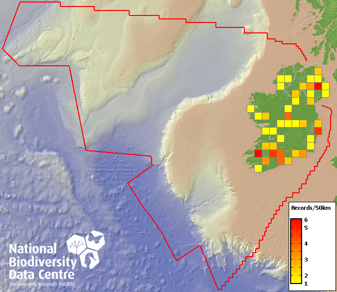 Distribution of the number of records recorded within each 10km grid square (ITM).Marine Map - 50km