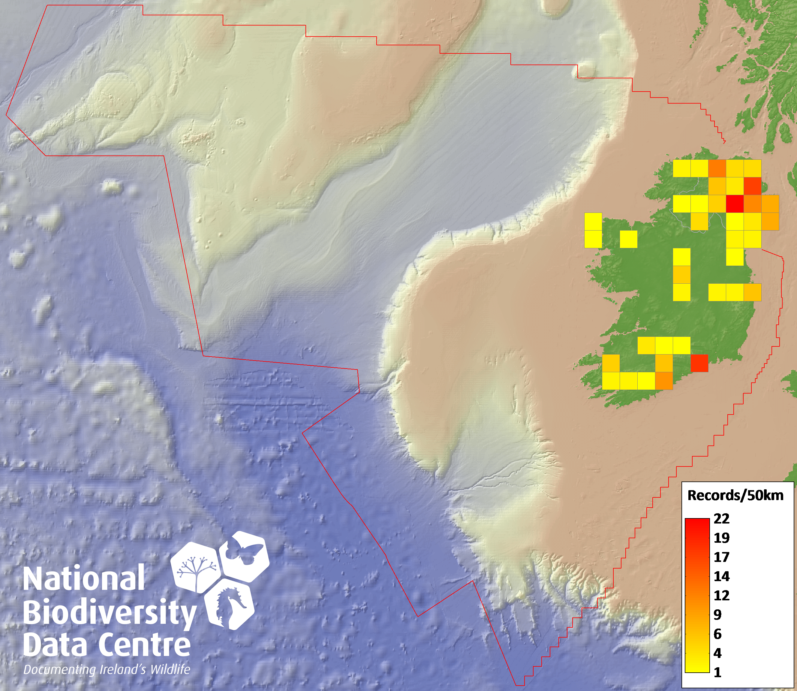 Distribution of the number of records recorded within each 10km grid square (ITM).Marine Map - 50km