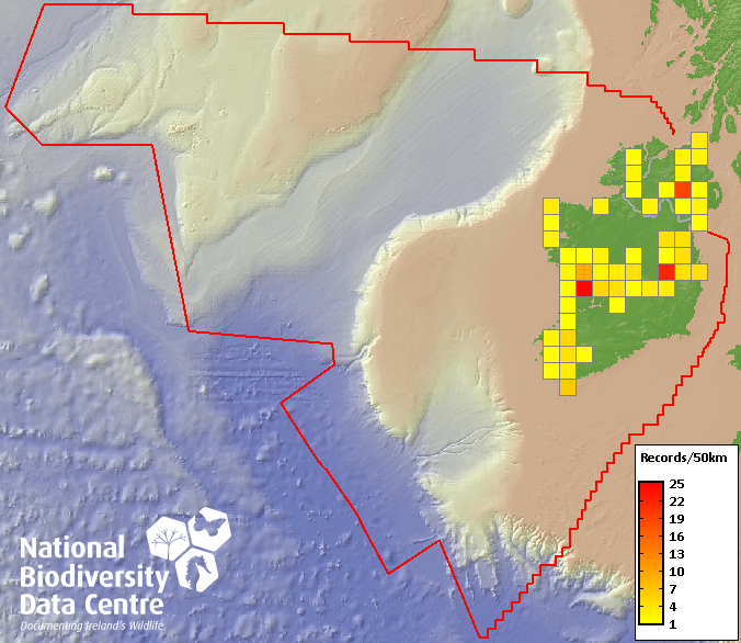 Distribution of the number of records recorded within each 10km grid square (ITM).Marine Map - 50km