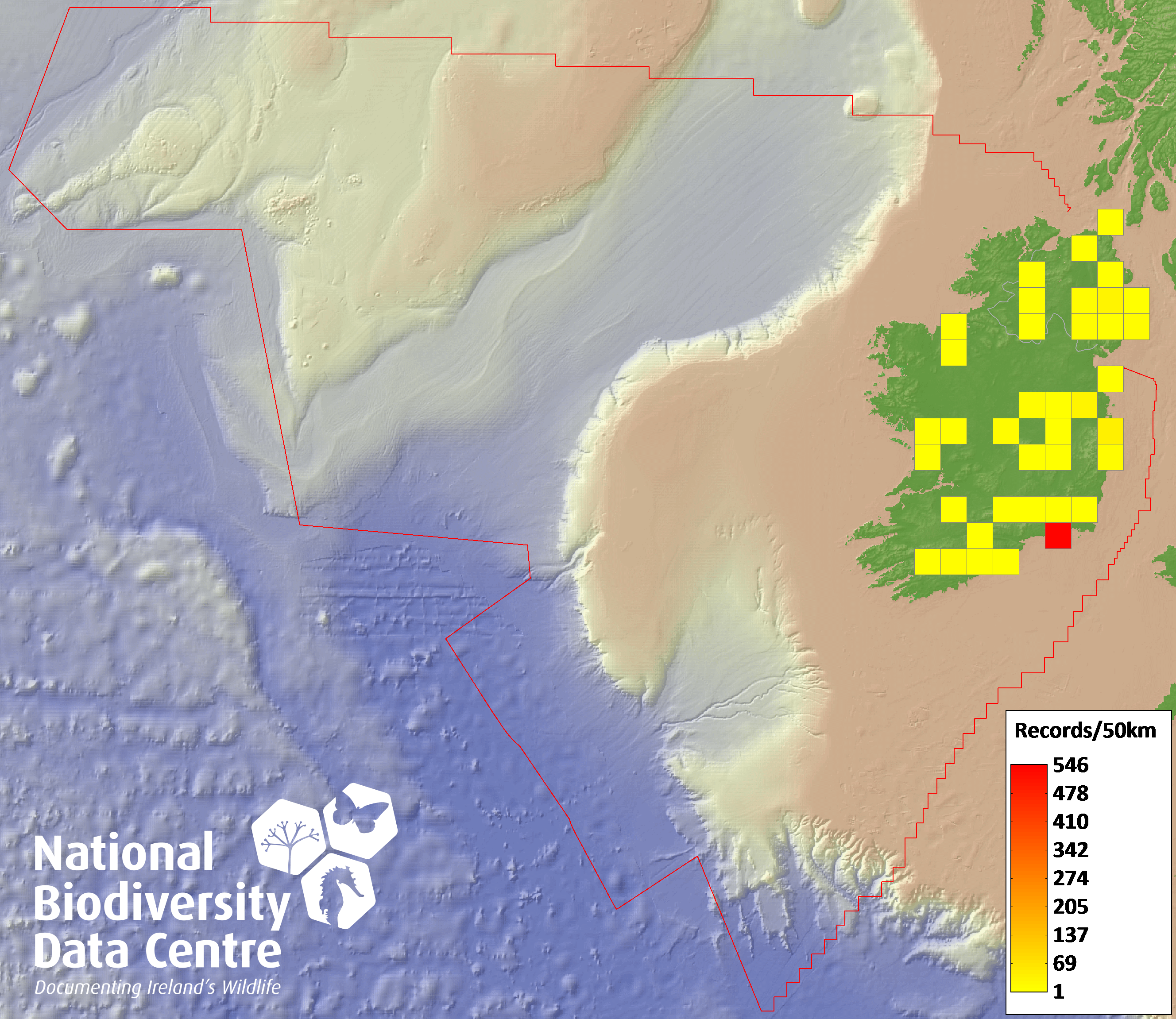 Distribution of the number of records recorded within each 10km grid square (ITM).Marine Map - 50km