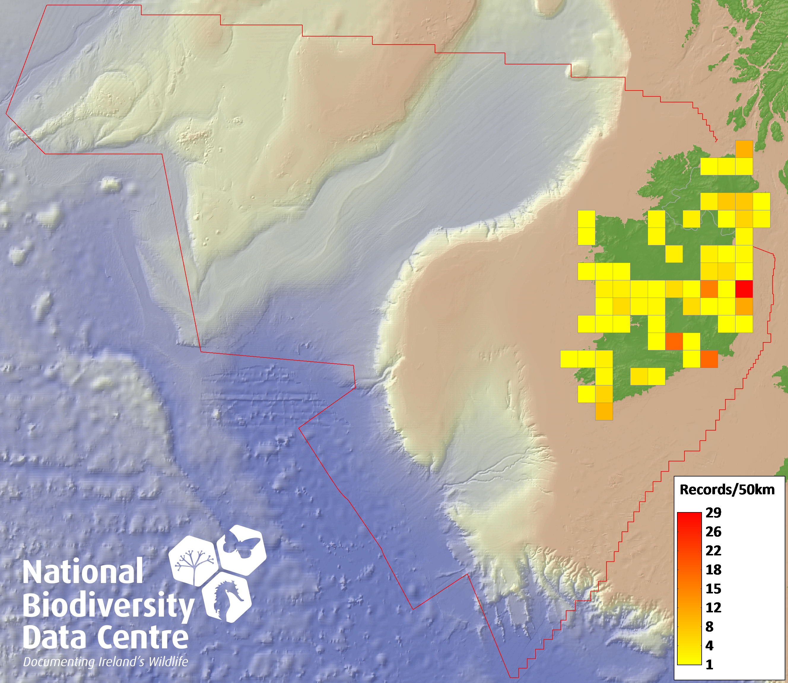 Distribution of the number of records recorded within each 10km grid square (ITM).Marine Map - 50km