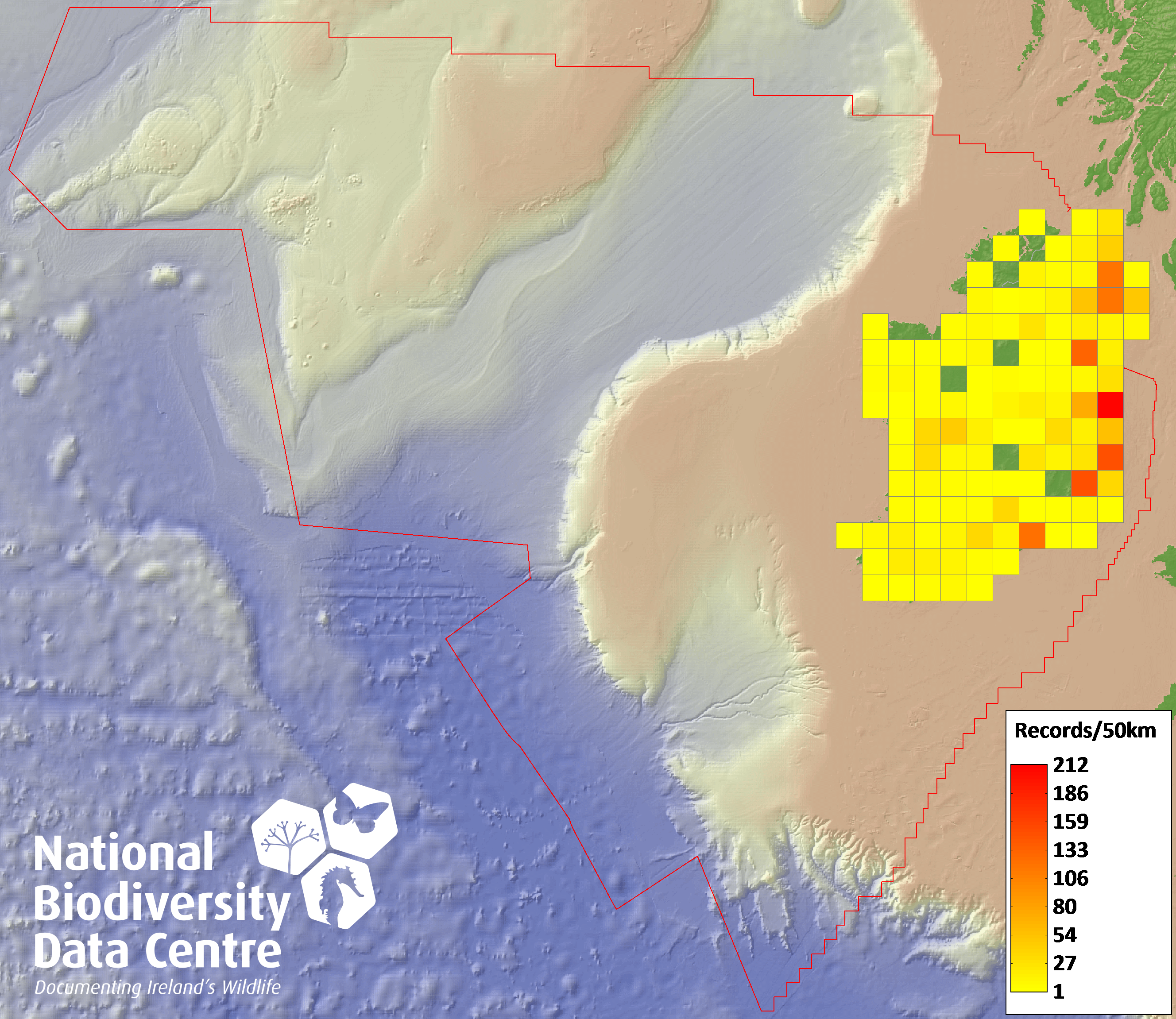 Distribution of the number of records recorded within each 10km grid square (ITM).Marine Map - 50km
