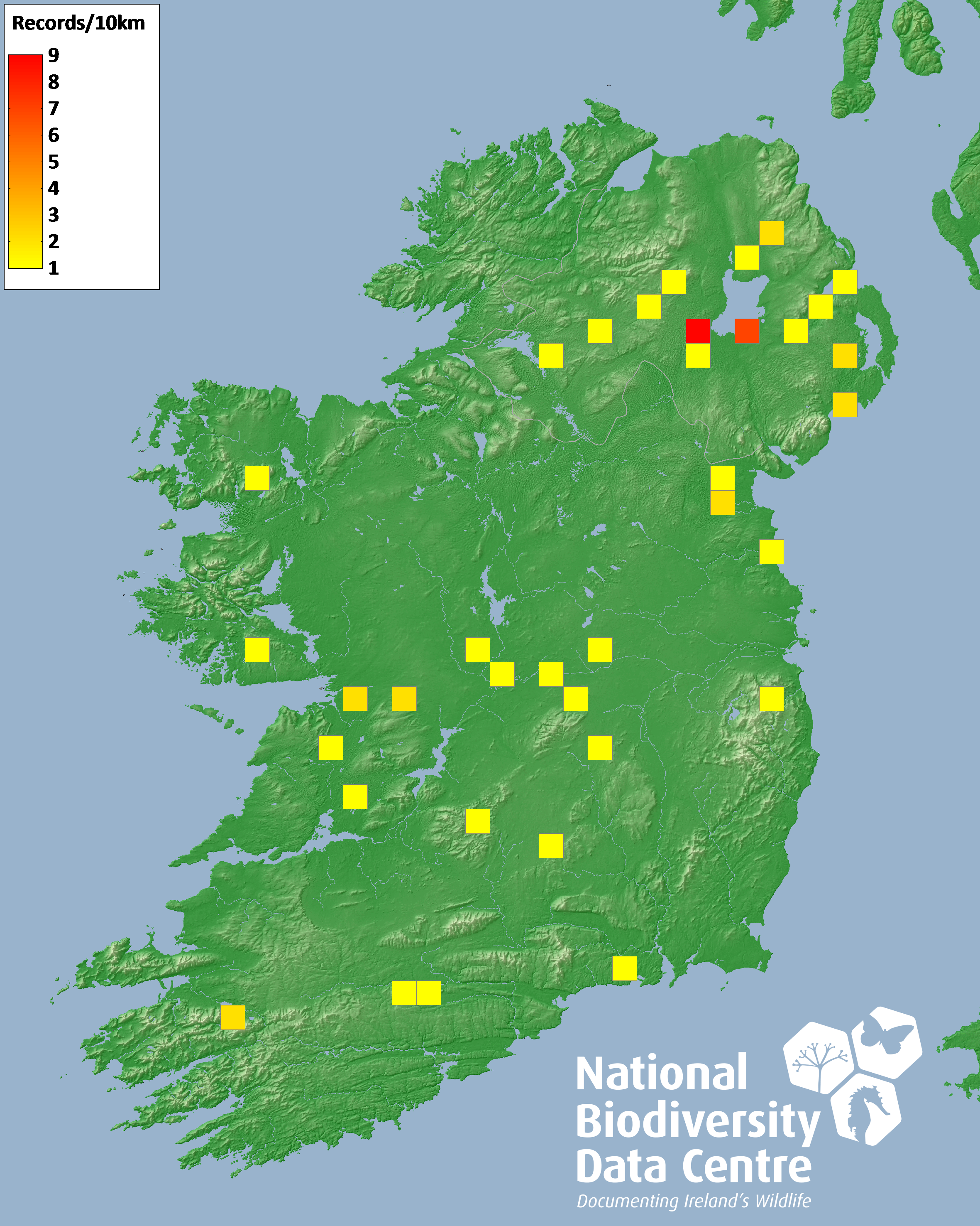 Distribution of the number of records recorded within each 10km grid square (ITM).Marine Map - 50km