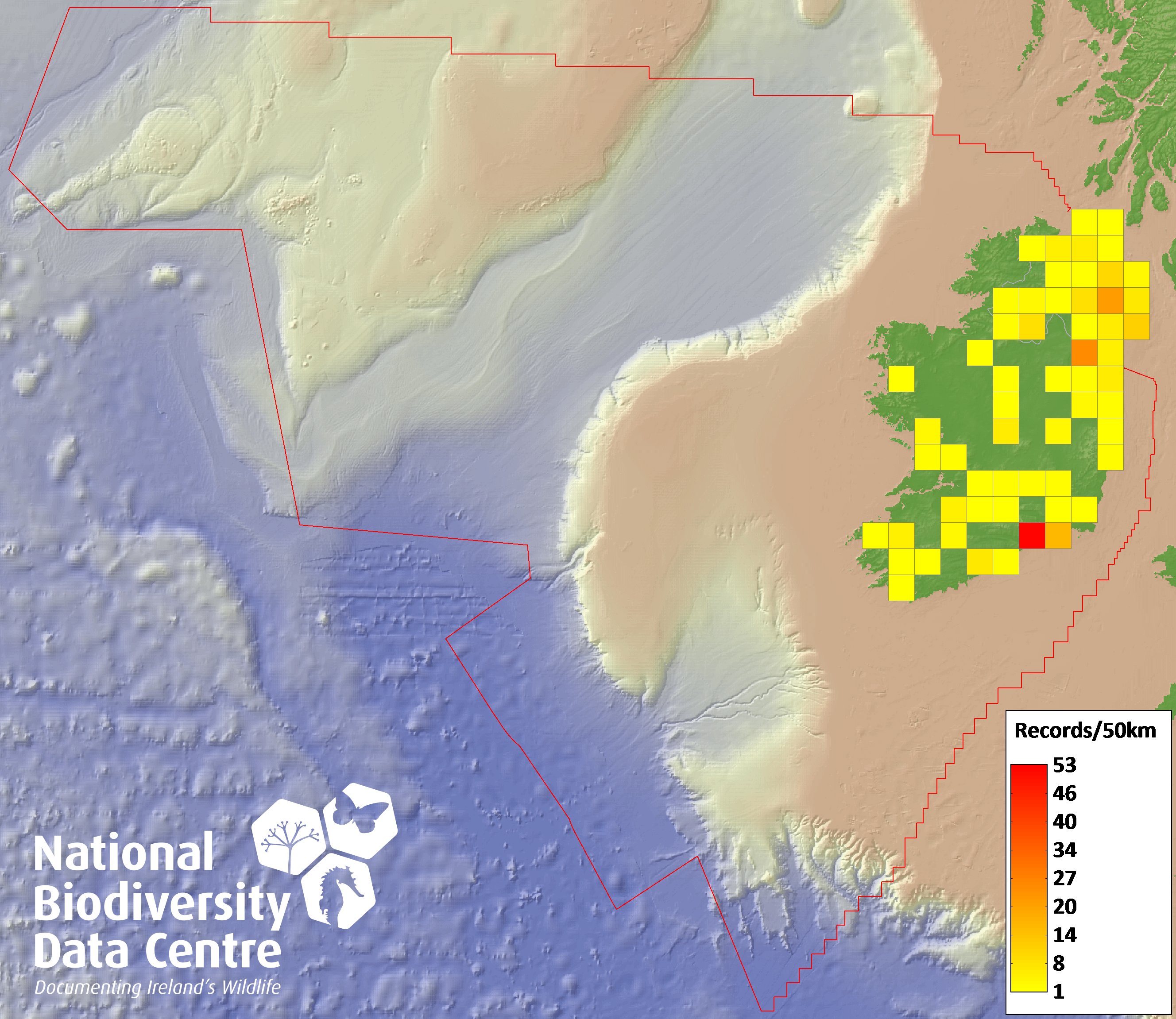 Distribution of the number of records recorded within each 10km grid square (ITM).Marine Map - 50km