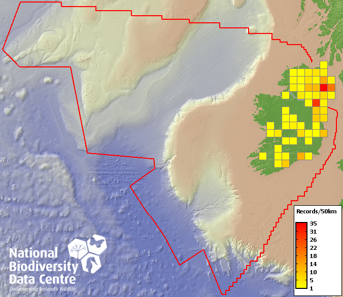 Distribution of the number of records recorded within each 10km grid square (ITM).Marine Map - 50km